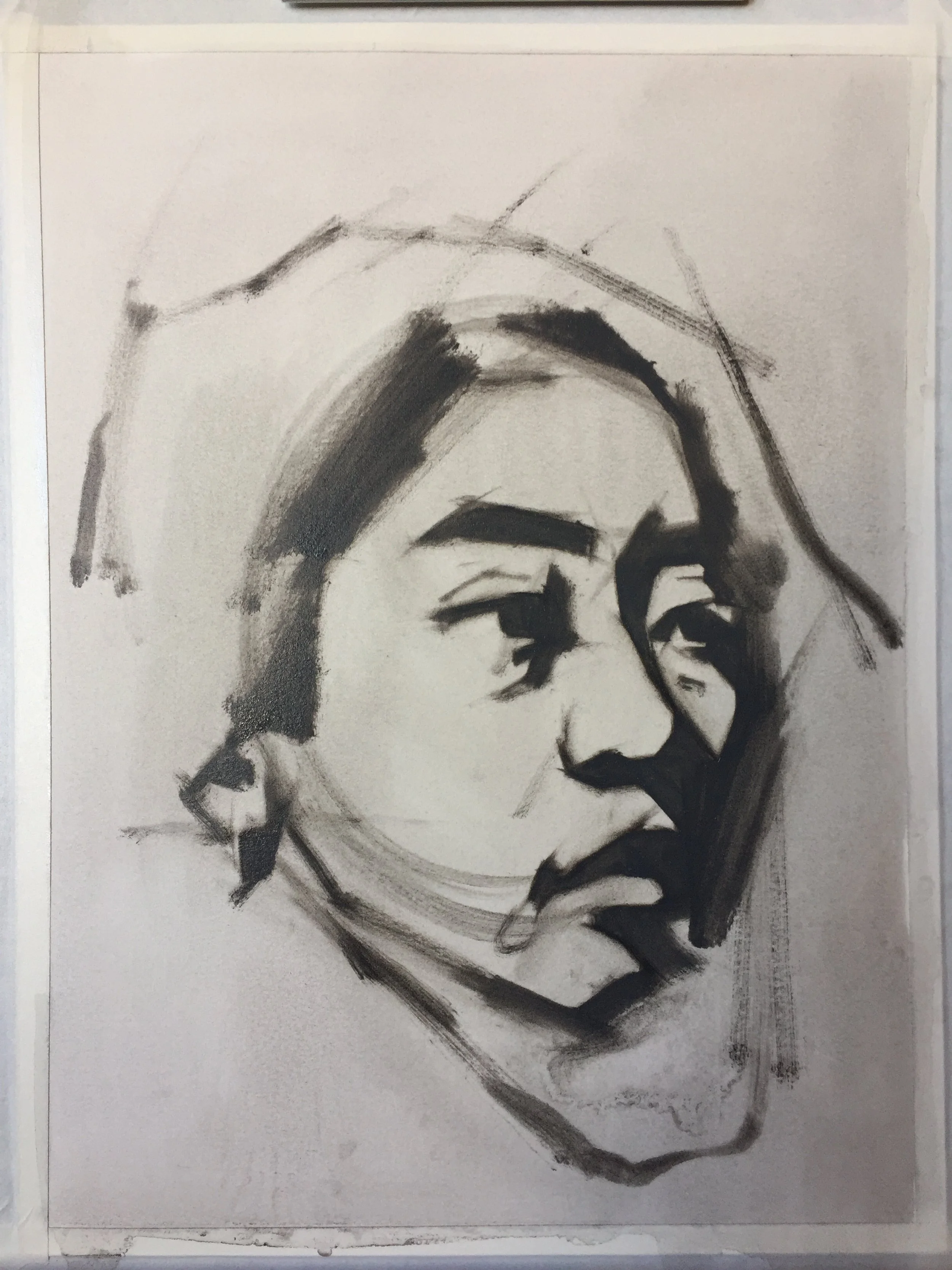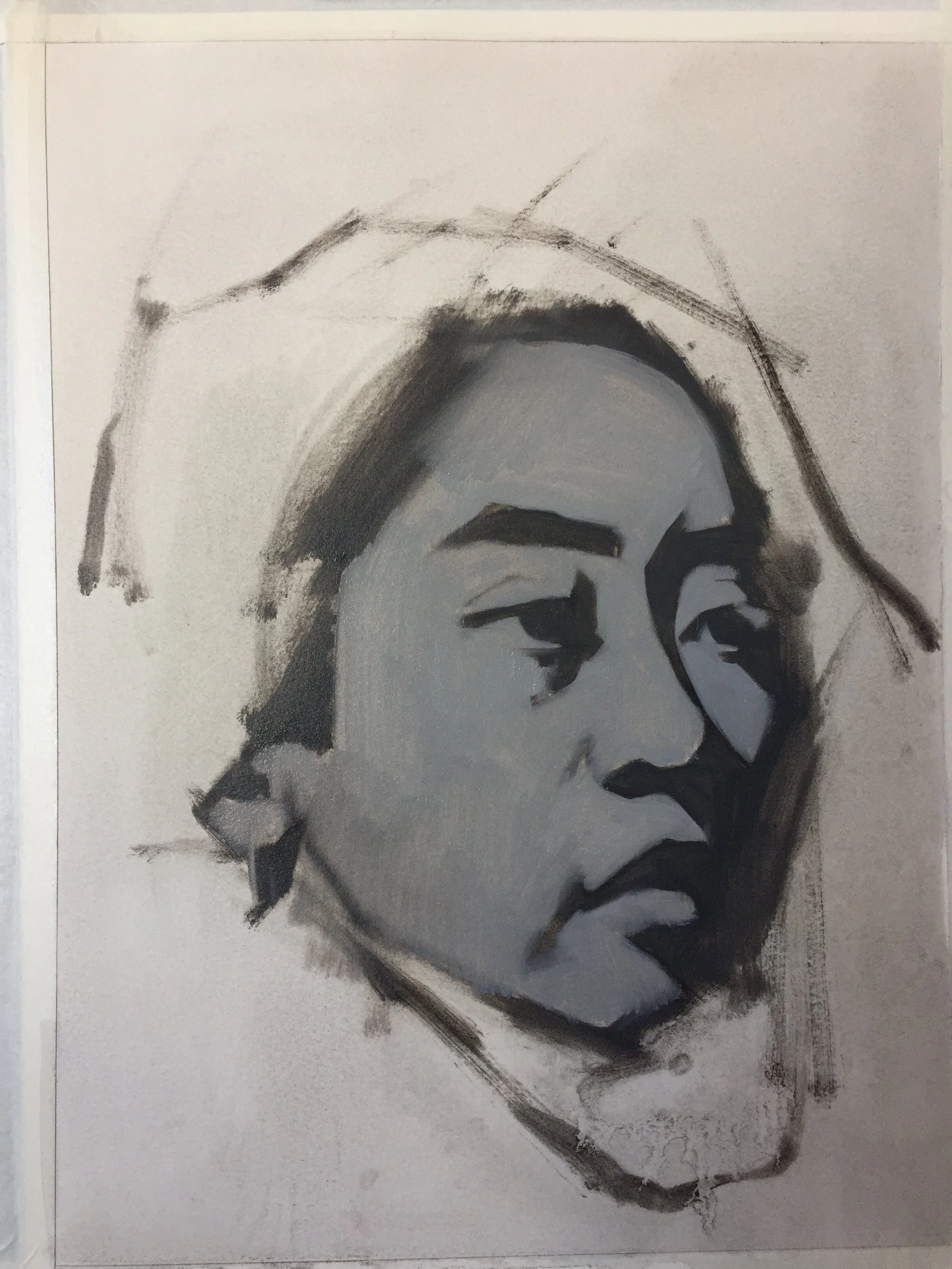 I suggest you to continue to use my step by step alla prima method from the Sargent Copy Lesson, but instead of mixing average value and color, simply mix average values. I’ll add it below. But, any method you use will be aided by a study honing your ability to see and mix values. If you use a method different than mine and wish for a live critique, please be able to describe your method to me step by step.