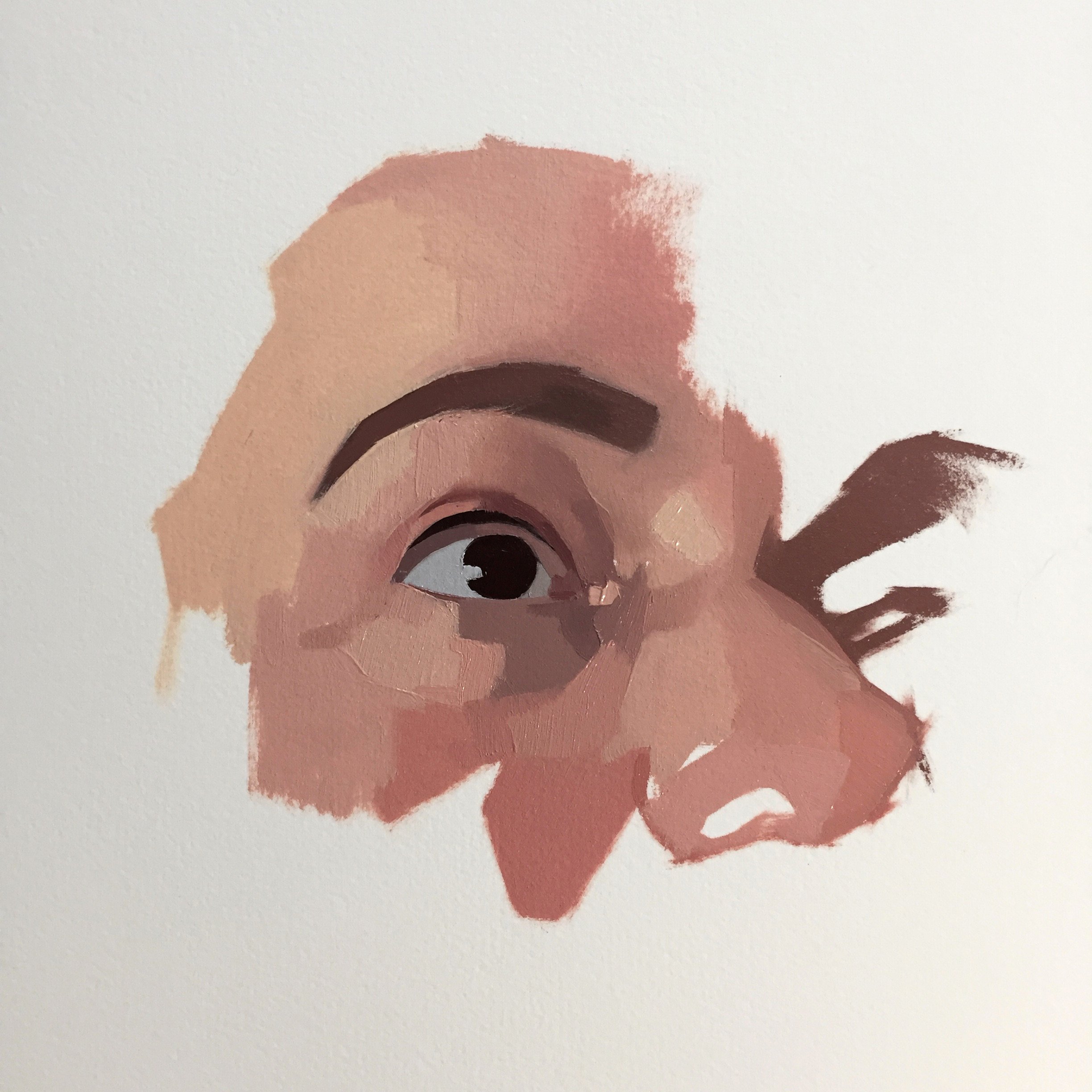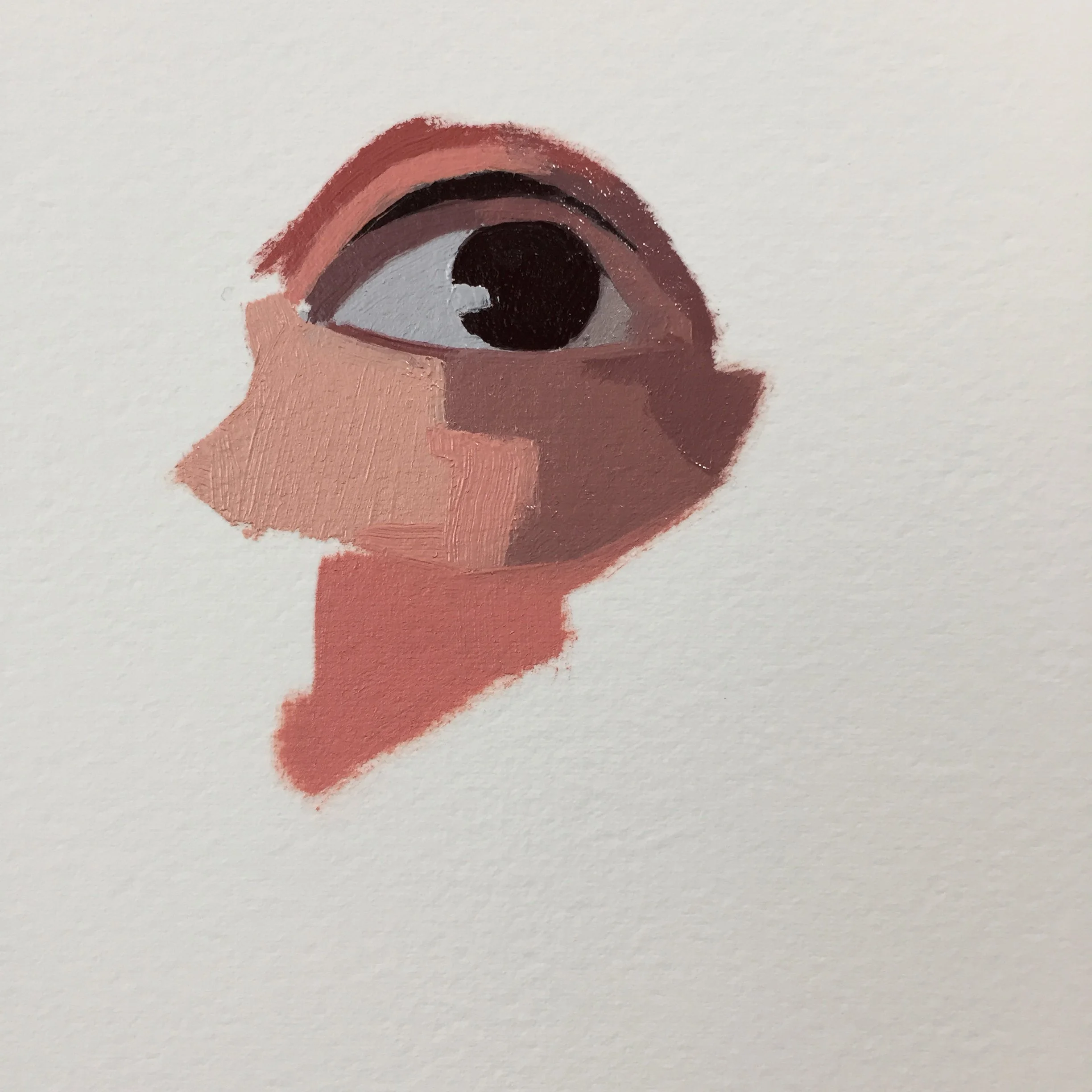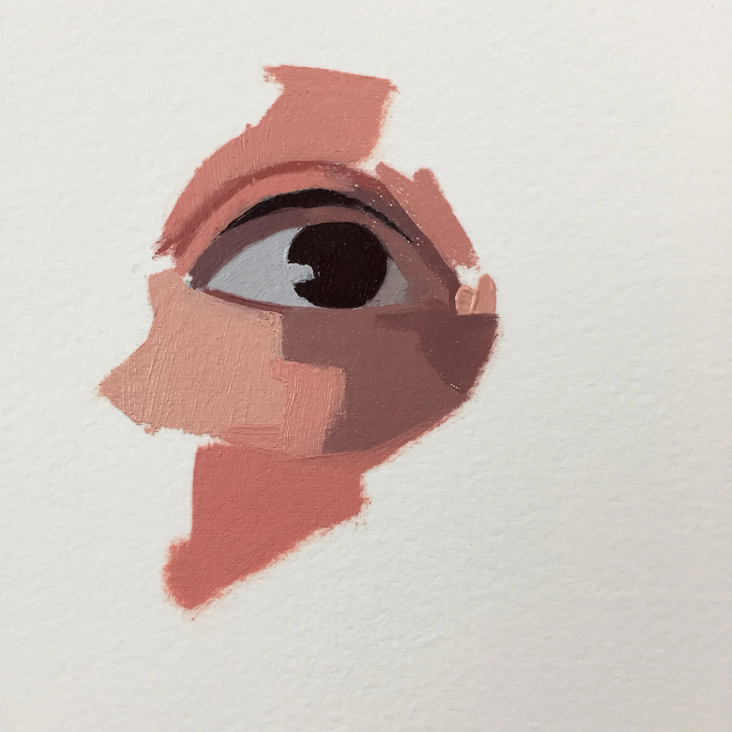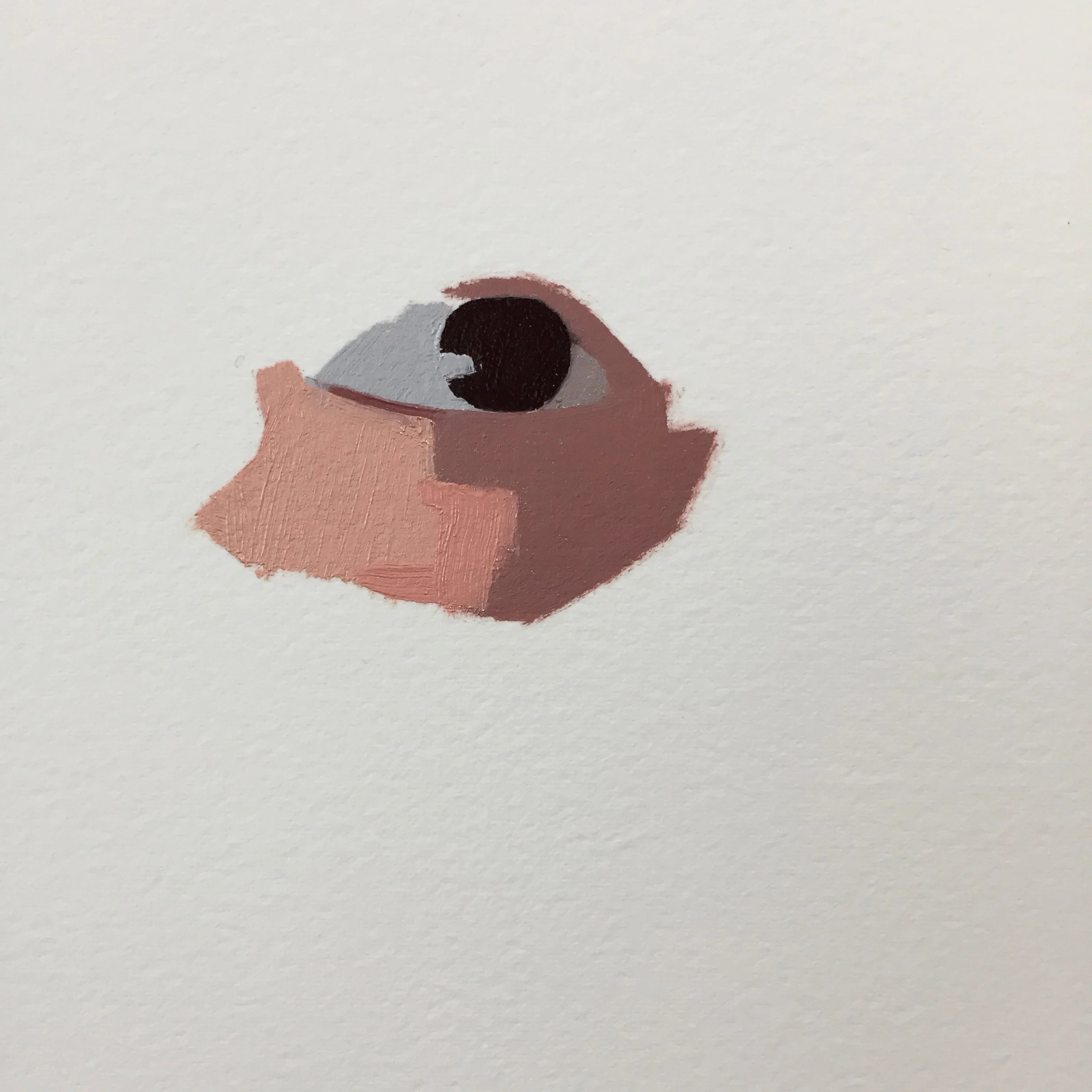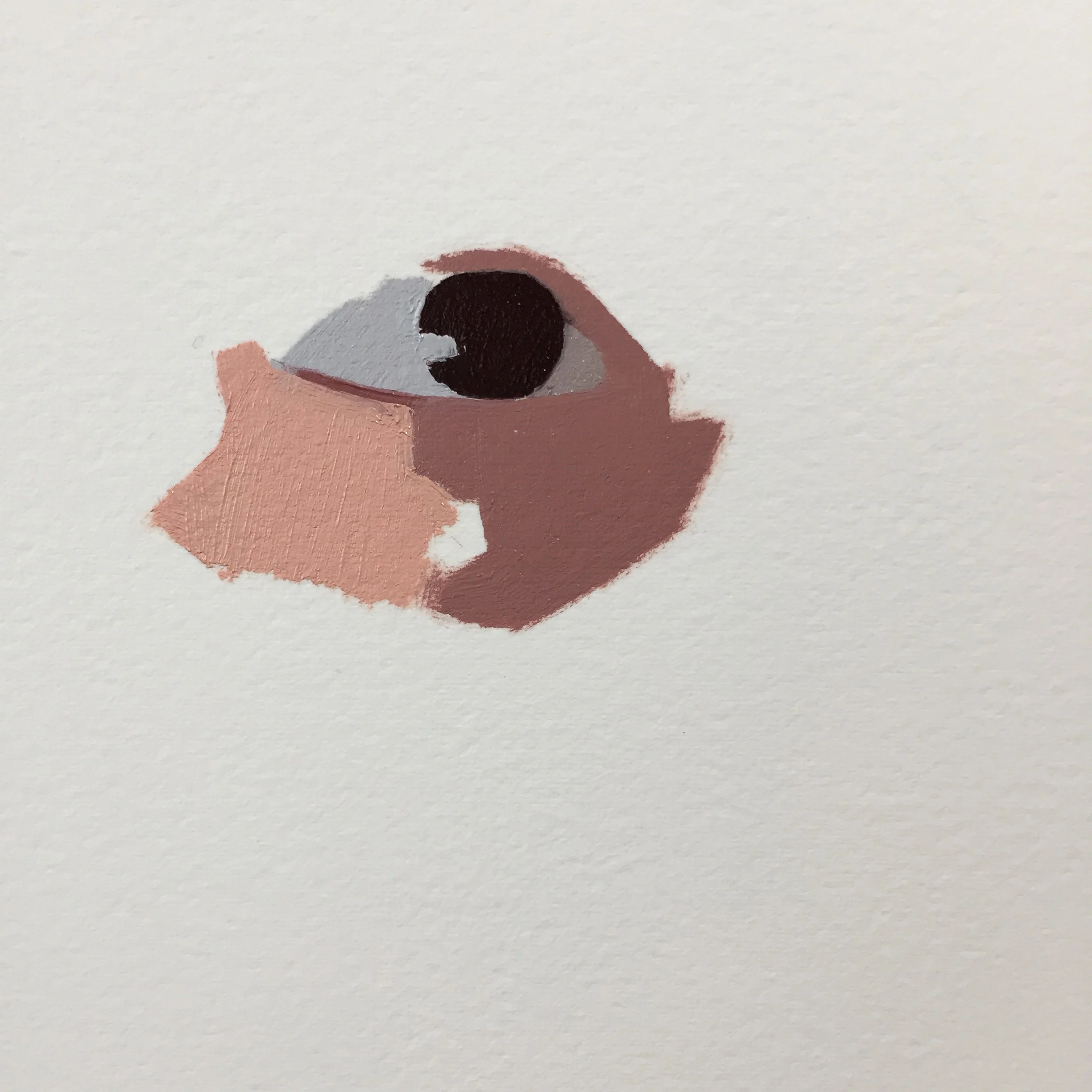 Choose the very next shape that is touching the first shape you made (eyelid or white of the eye… for example) and try to mix the right color and value for that second shape - then place that paint in the correct spot on the canvas in the correct shape for what you intended, and right next to your first shape. It will be easier if you place one shape next to the last rather than jump all around the canvas (that would be an extreme level of difficulty!).