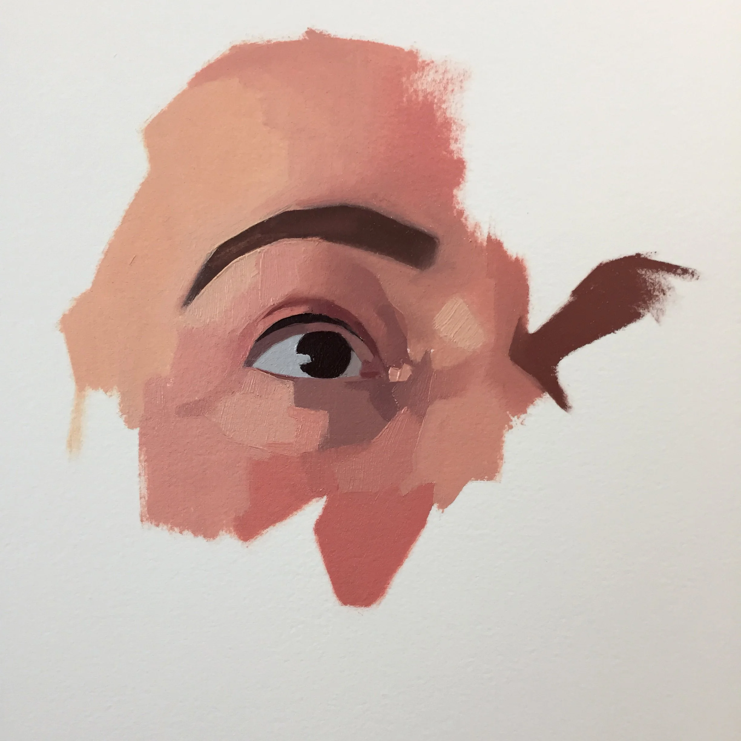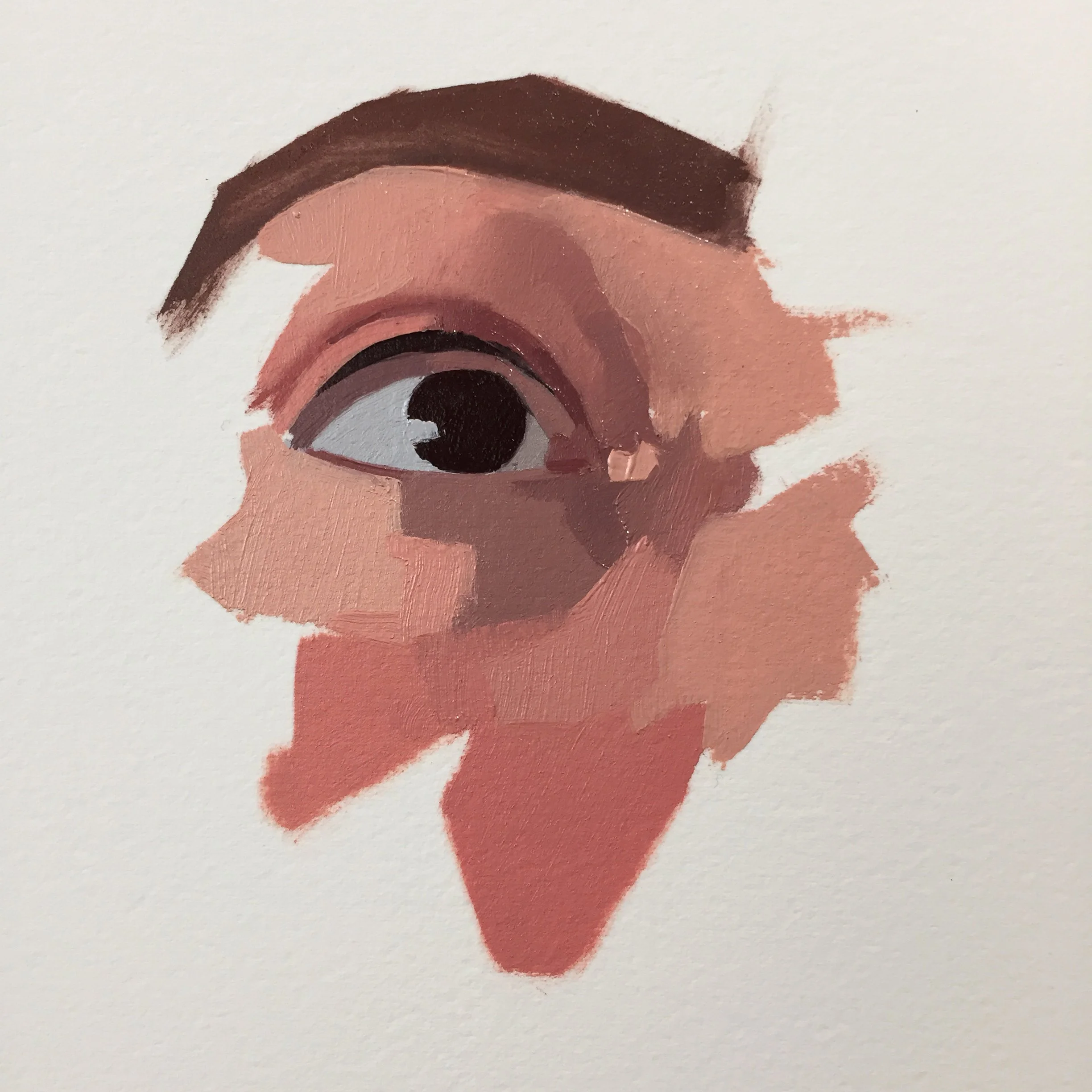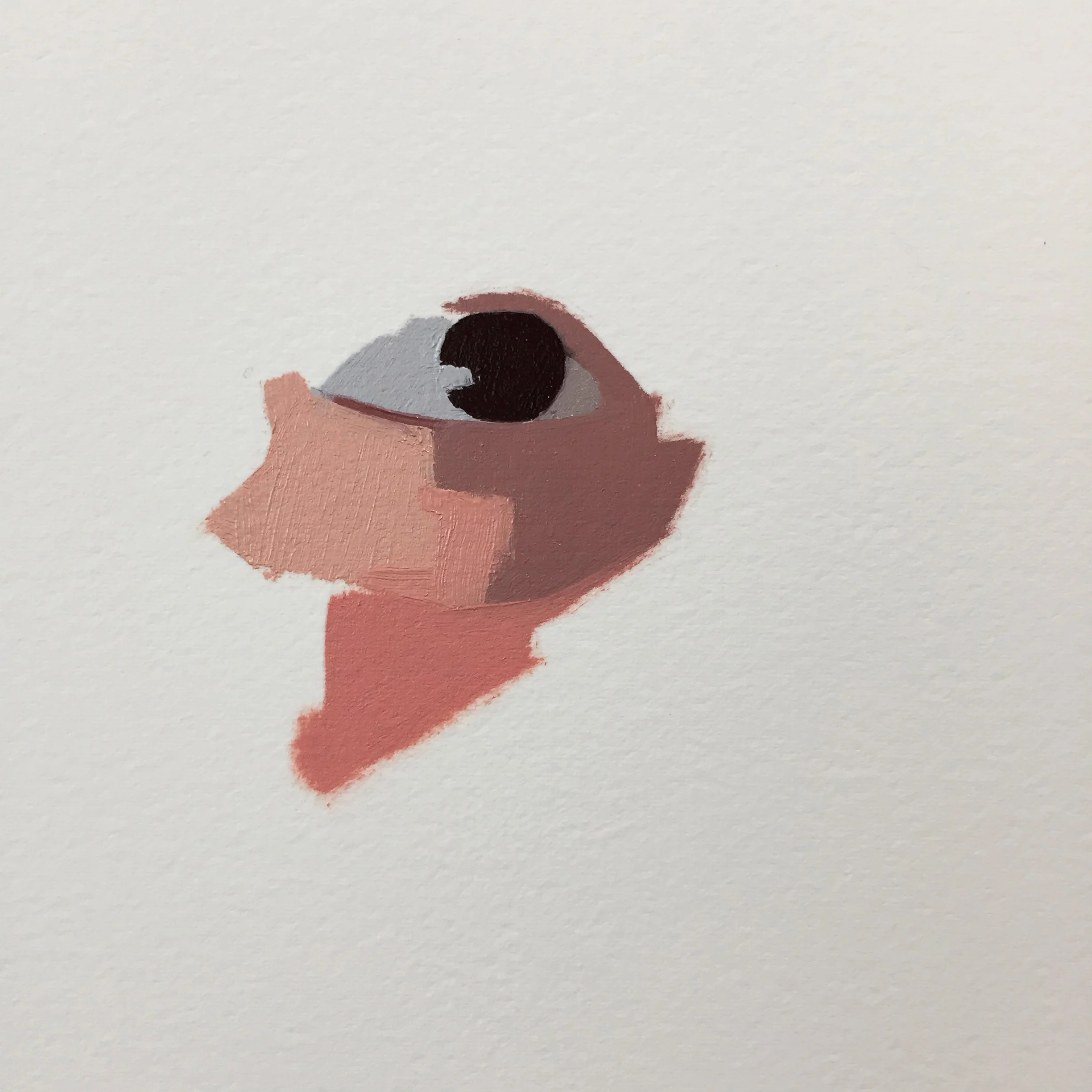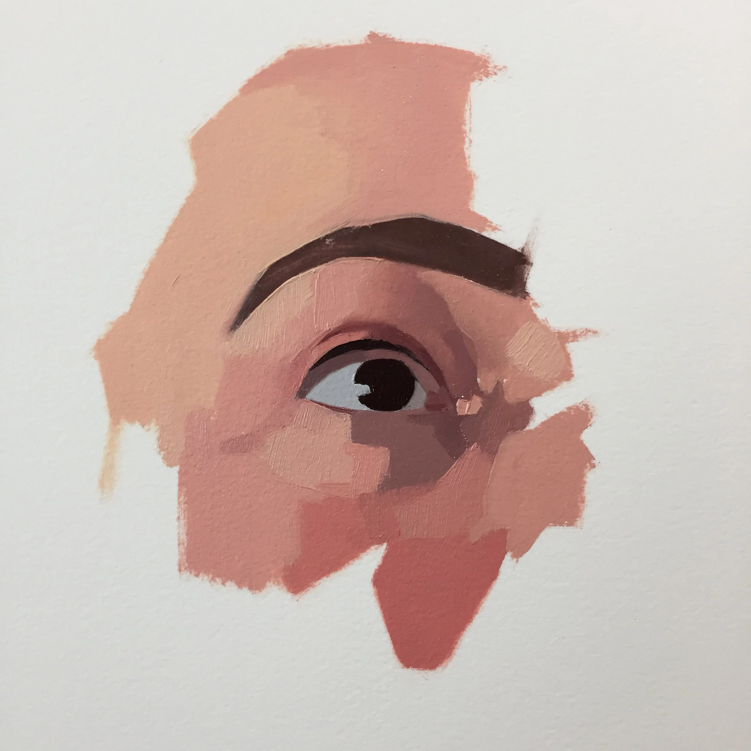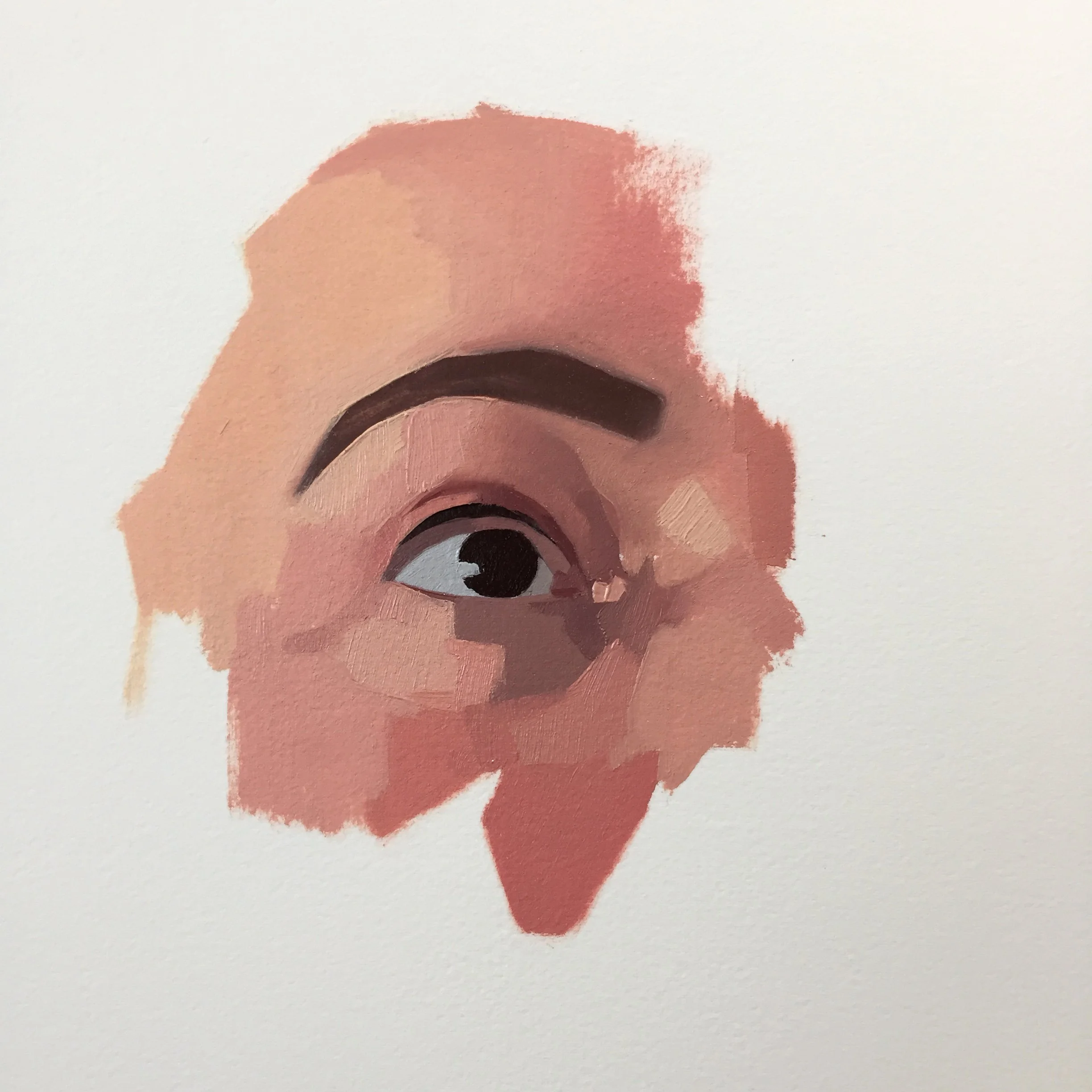 Choose the very next shape that is touching the first shape you made (eyelid or white of the eye… for example) and try to mix the right color and value for that second shape - then place that paint in the correct spot on the canvas in the correct shape for what you intended, and right next to your first shape. It will be easier if you place one shape next to the last rather than jump all around the canvas (that would be an extreme level of difficulty!).