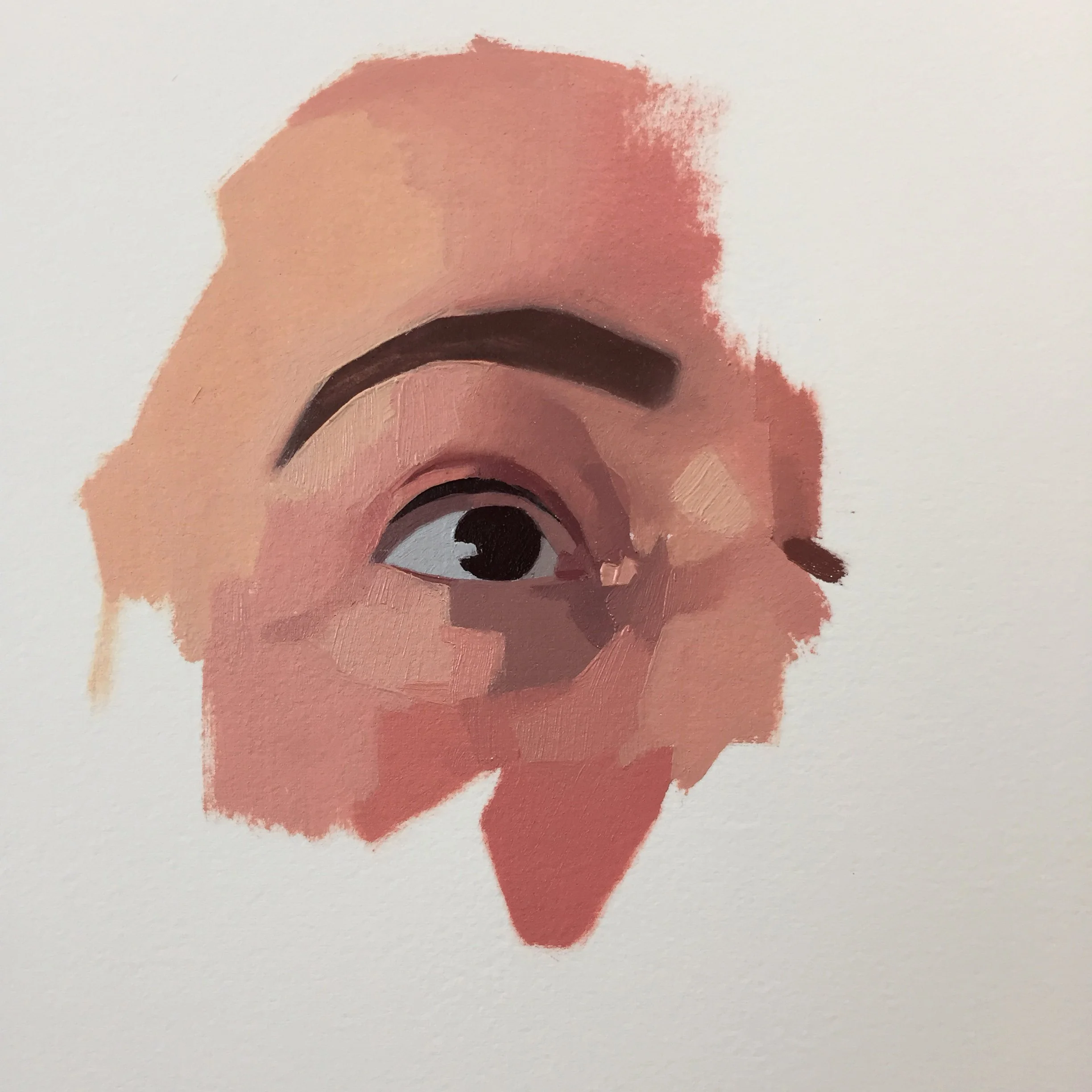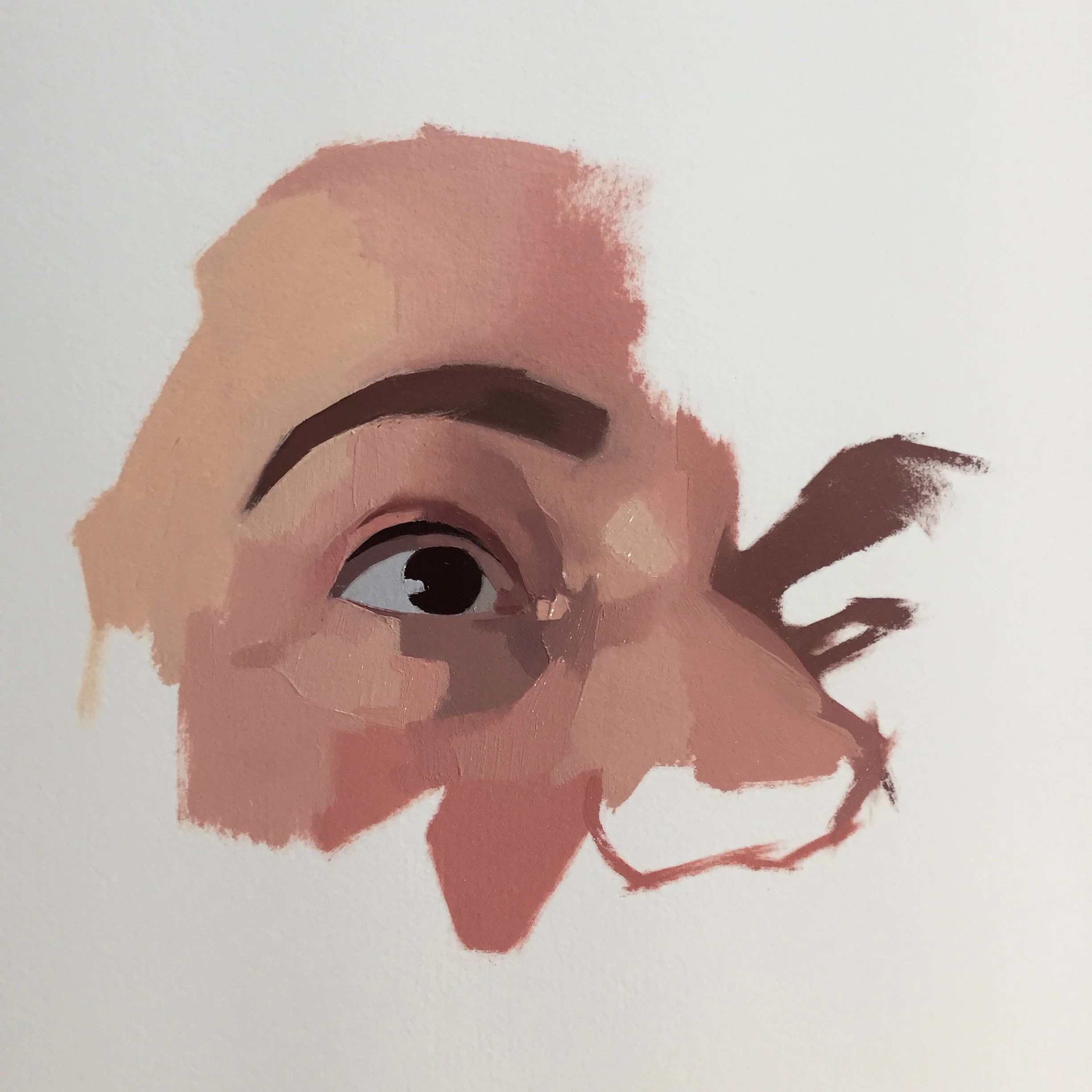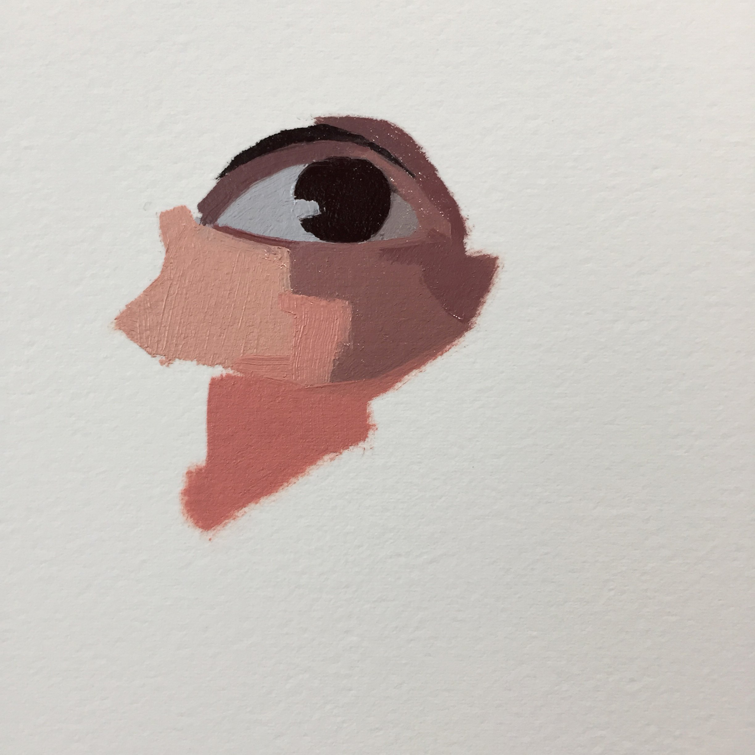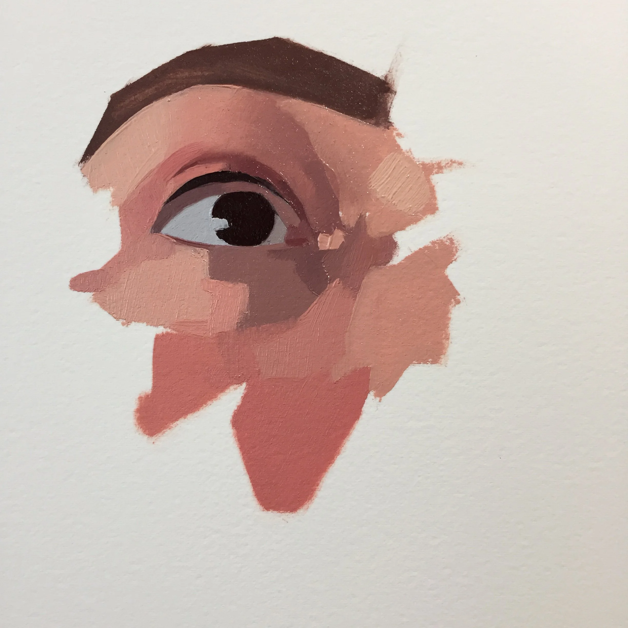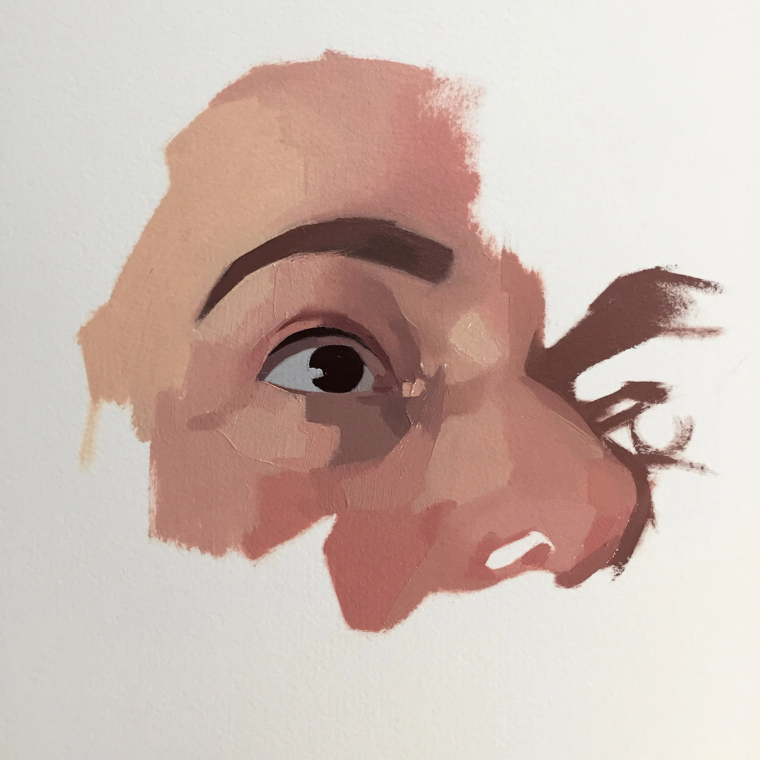 Choose the very next shape that is touching the first shape you made (eyelid or white of the eye… for example) and try to mix the right color and value for that second shape - then place that paint in the correct spot on the canvas in the correct shape for what you intended, and right next to your first shape. It will be easier if you place one shape next to the last rather than jump all around the canvas (that would be an extreme level of difficulty!).