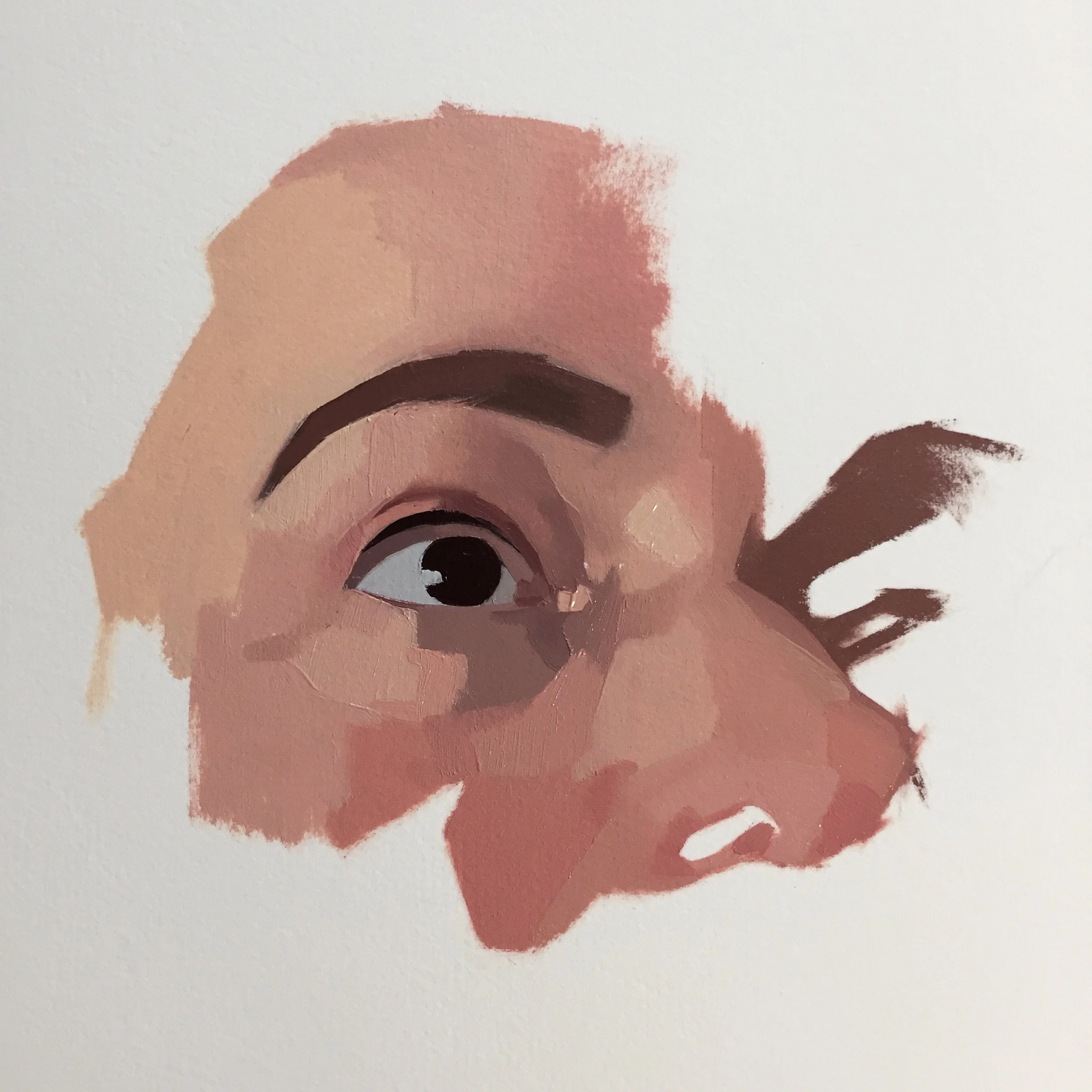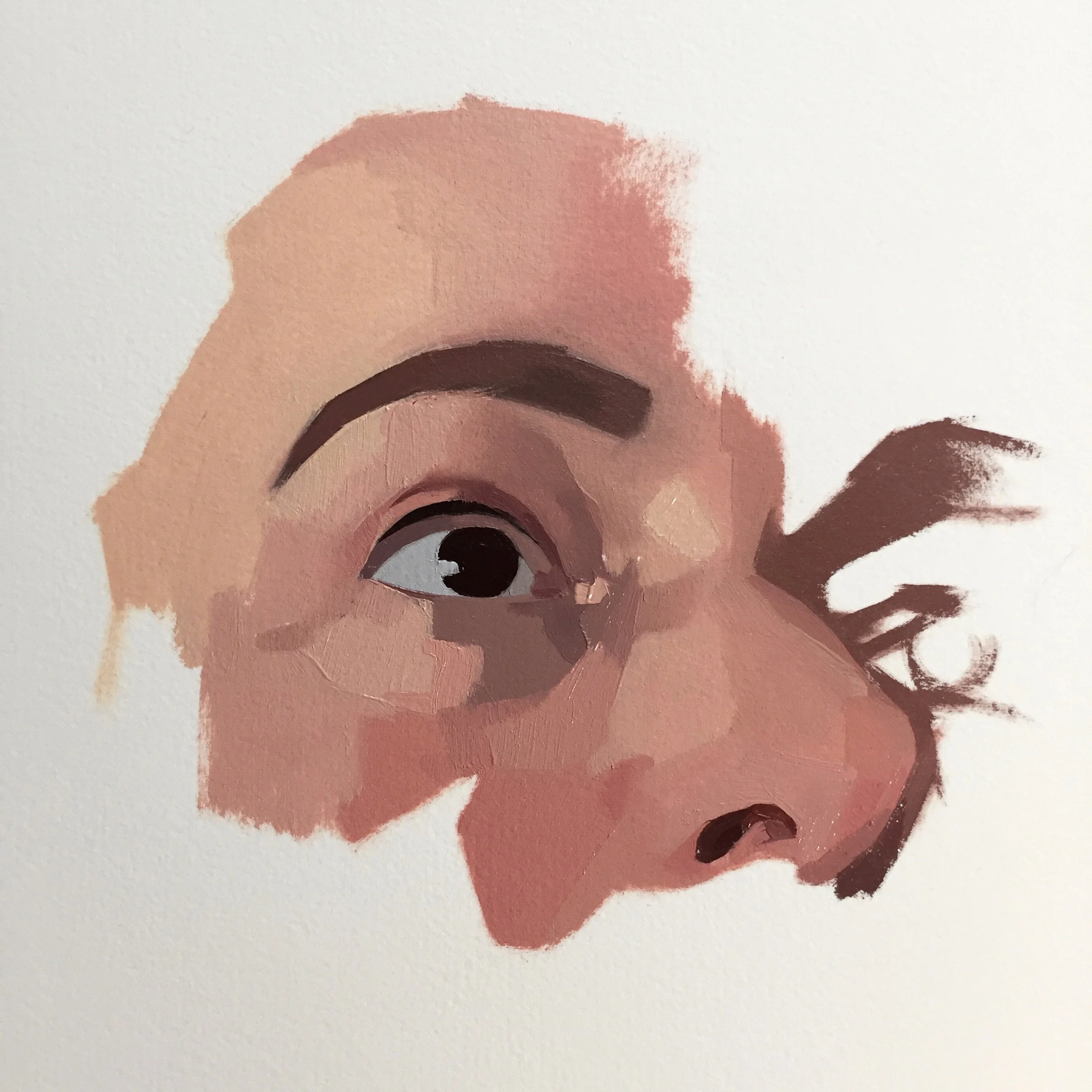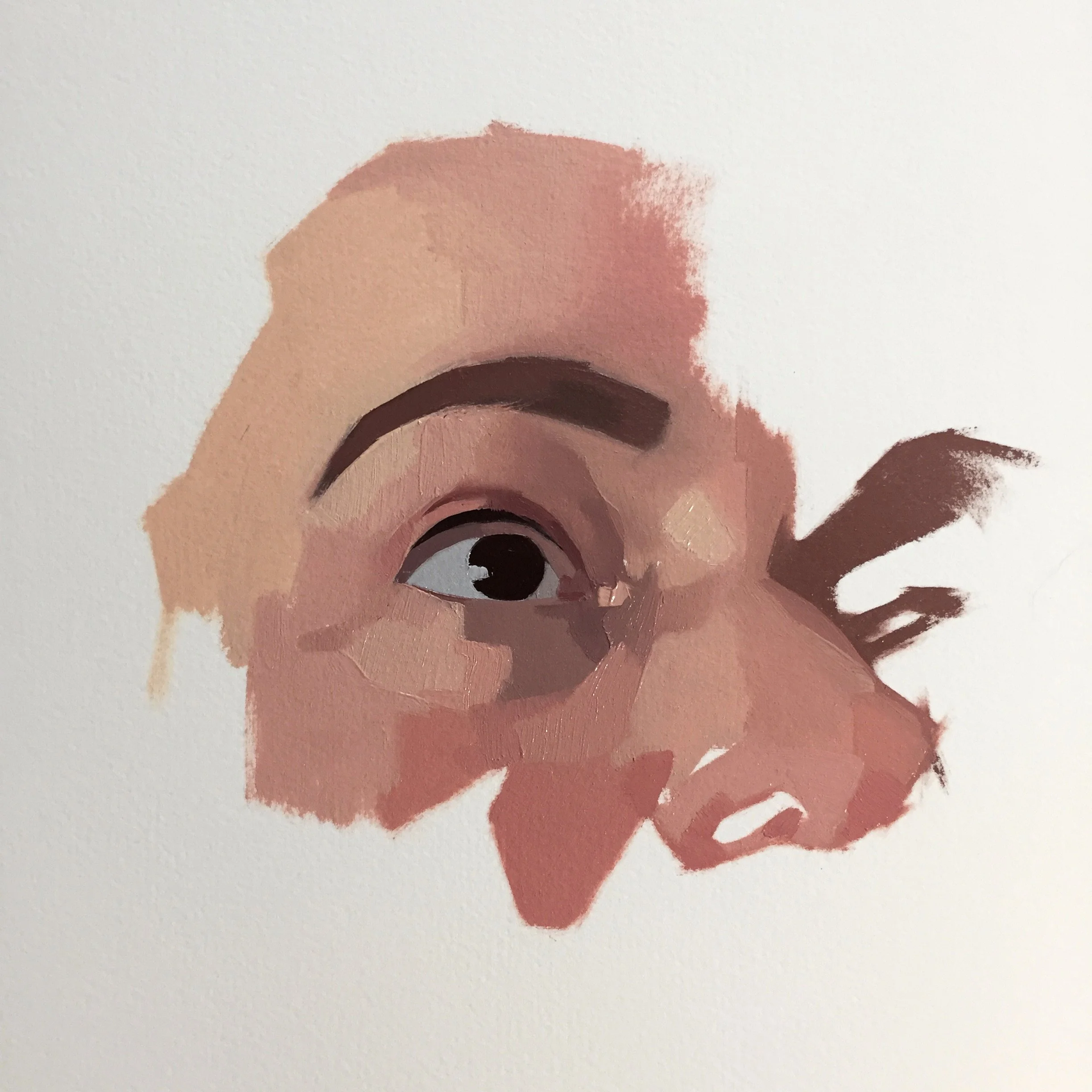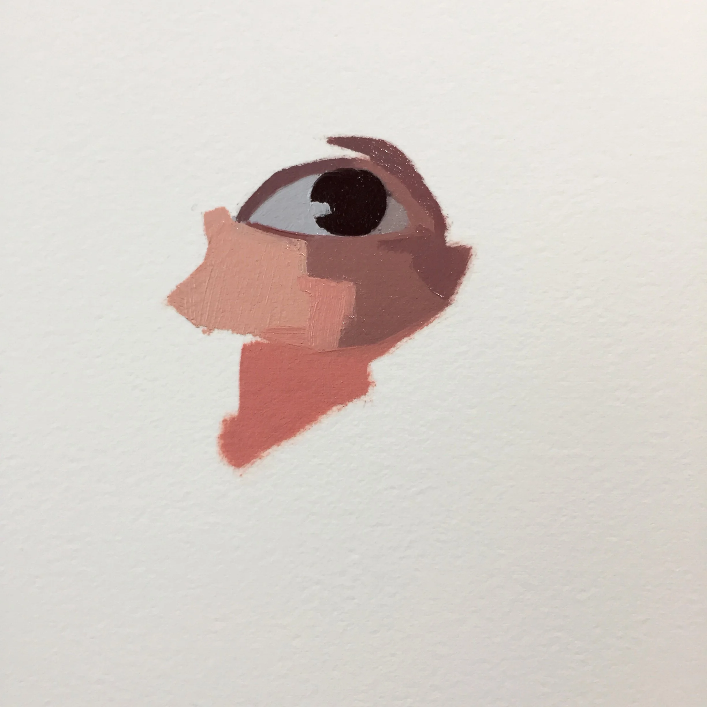 Choose the very next shape that is touching the first shape you made (eyelid or white of the eye… for example) and try to mix the right color and value for that second shape - then place that paint in the correct spot on the canvas in the correct shape for what you intended, and right next to your first shape. It will be easier if you place one shape next to the last rather than jump all around the canvas (that would be an extreme level of difficulty!).