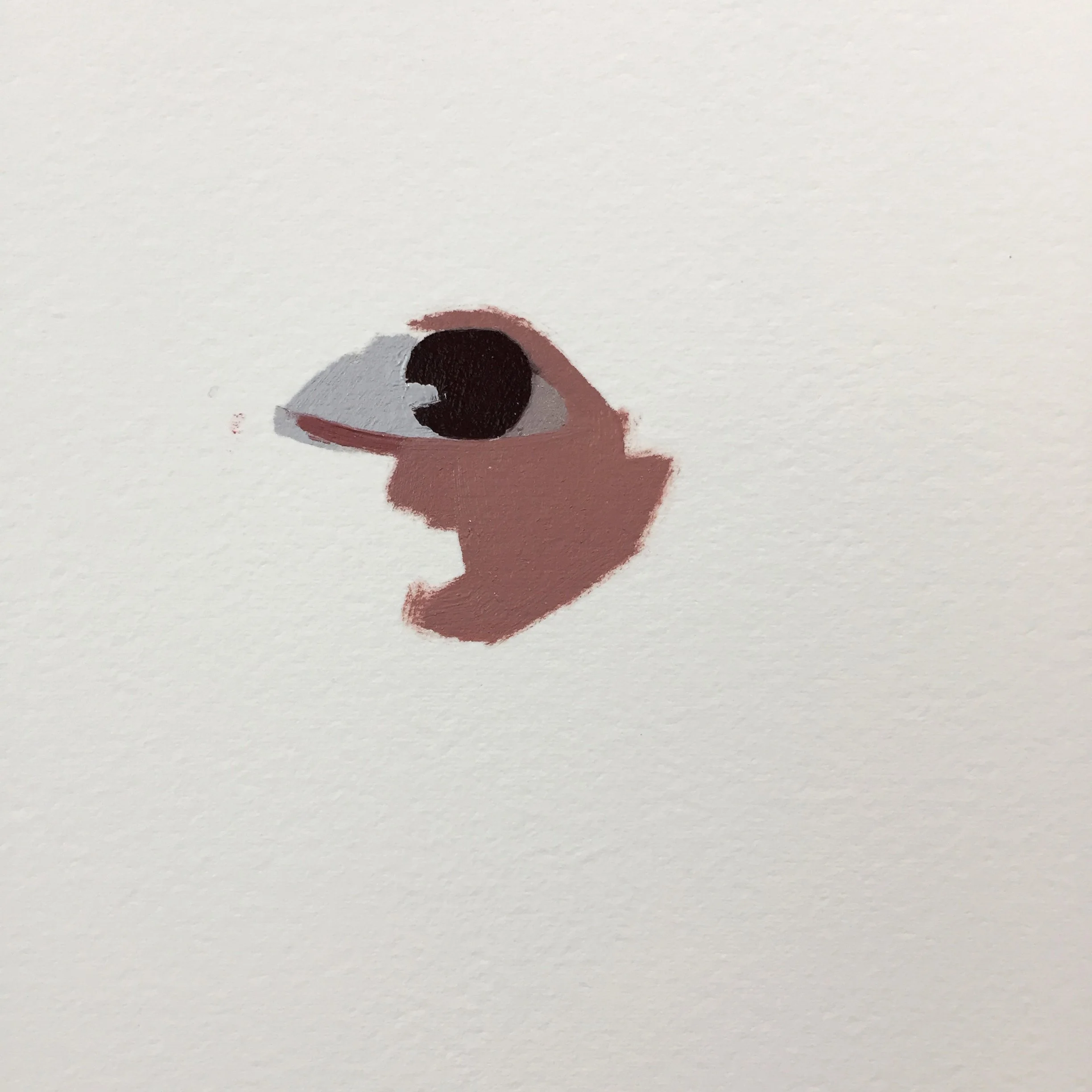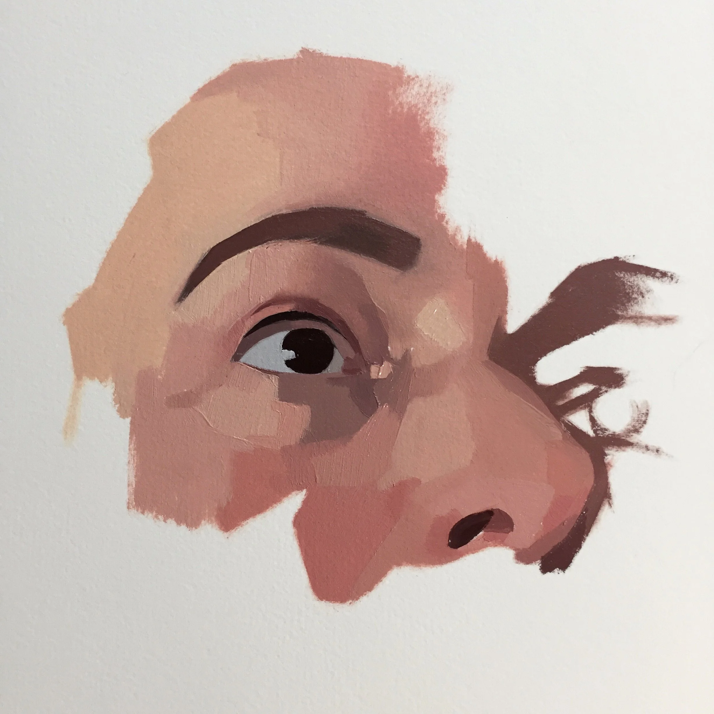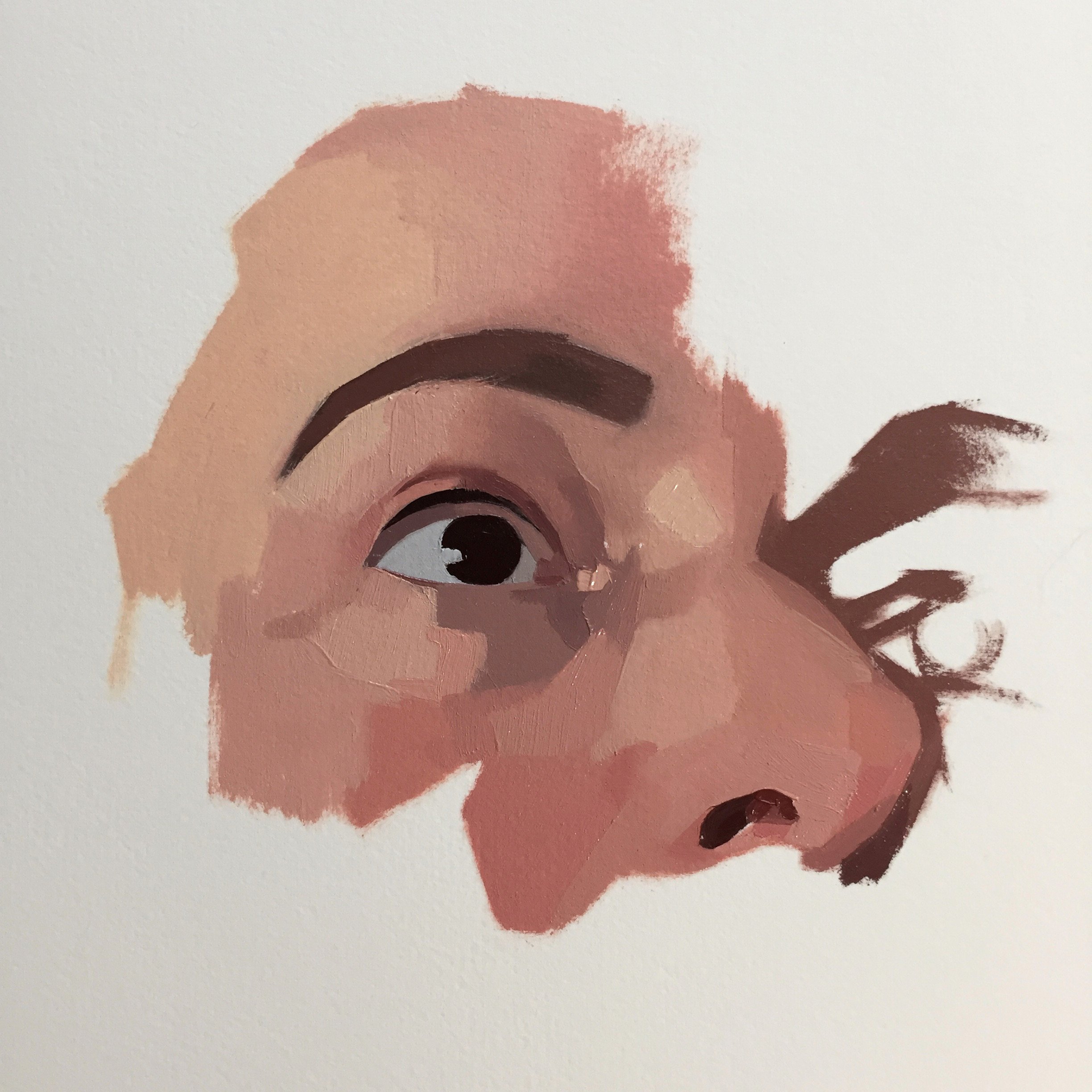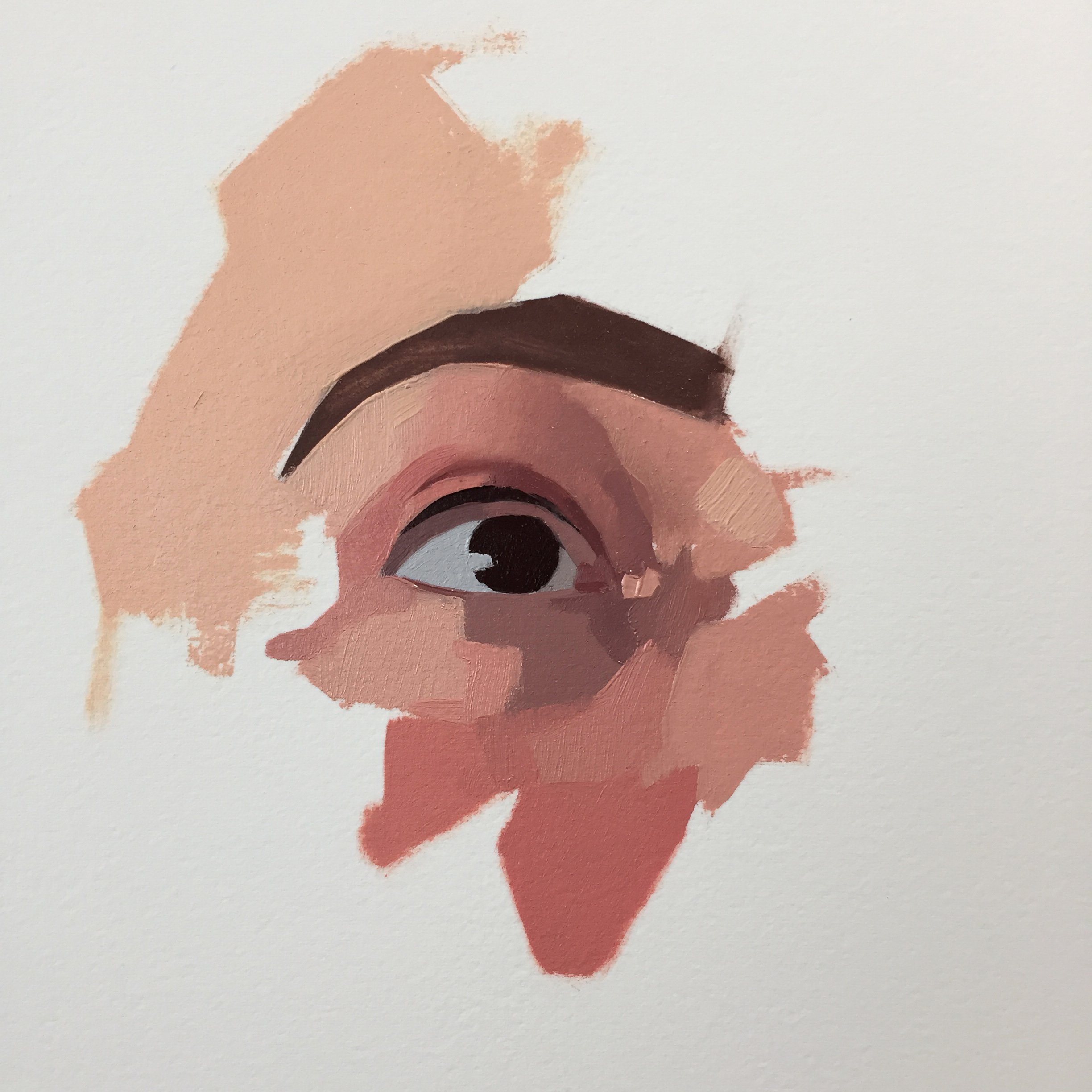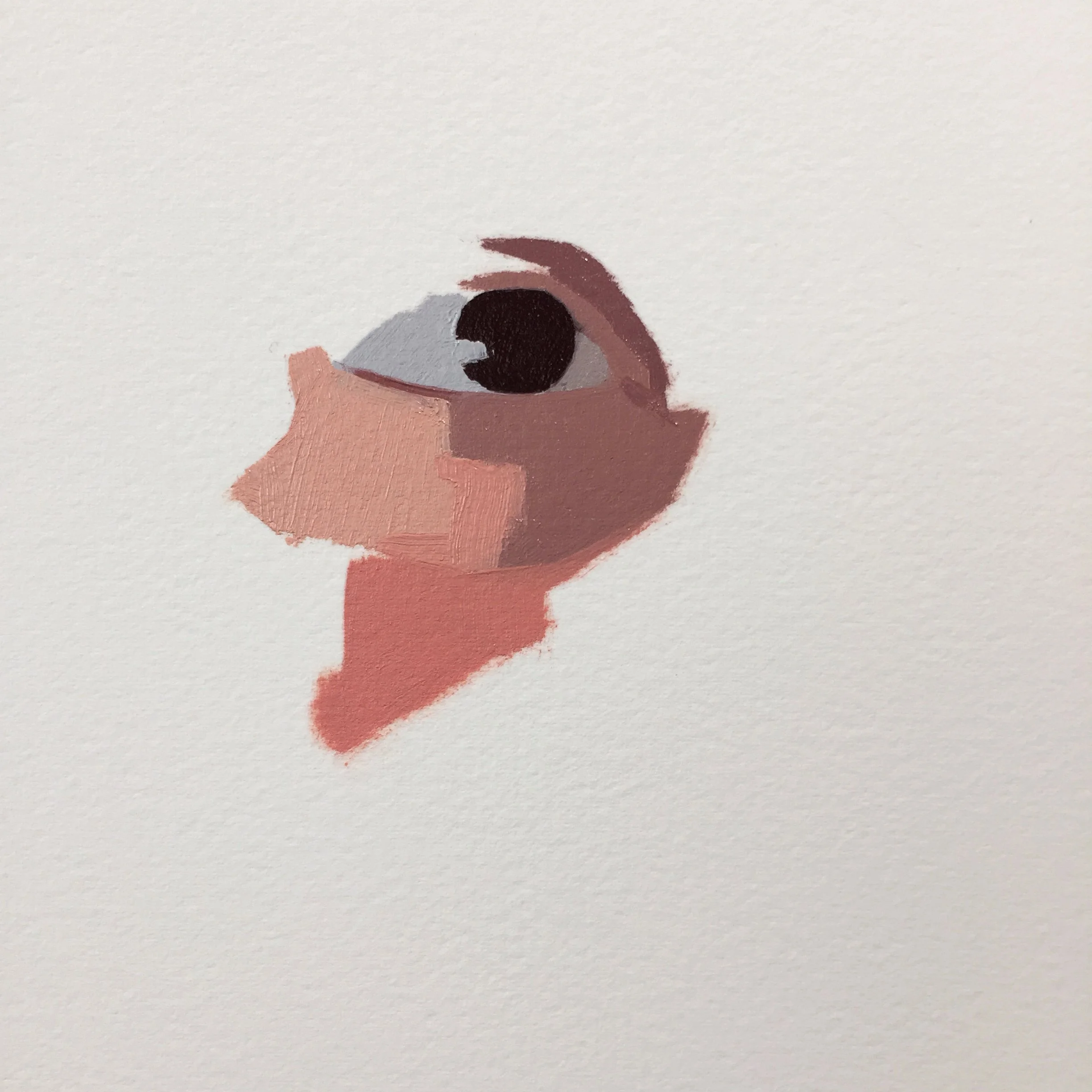 Choose the very next shape that is touching the first shape you made (eyelid or white of the eye… for example) and try to mix the right color and value for that second shape - then place that paint in the correct spot on the canvas in the correct shape for what you intended, and right next to your first shape. It will be easier if you place one shape next to the last rather than jump all around the canvas (that would be an extreme level of difficulty!).