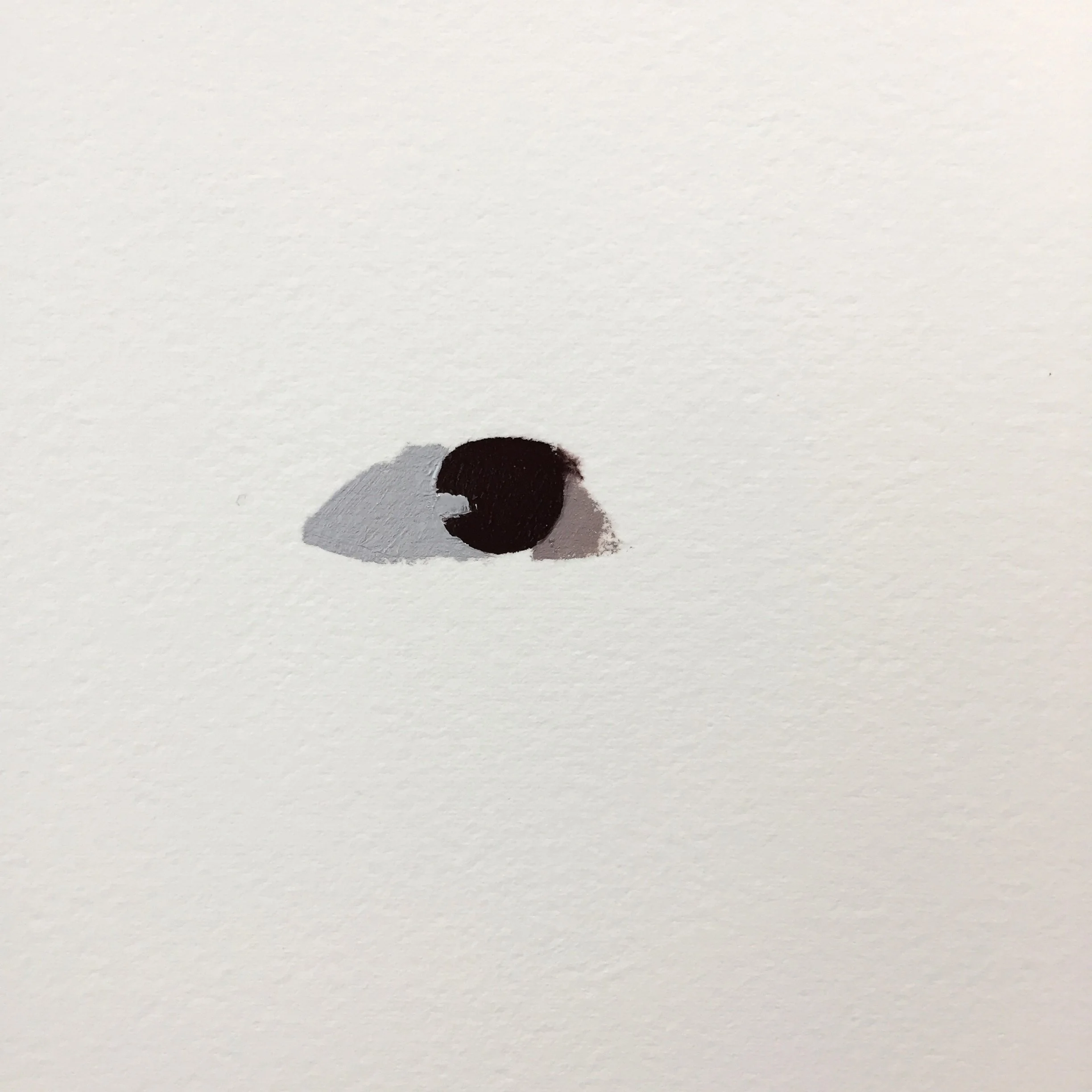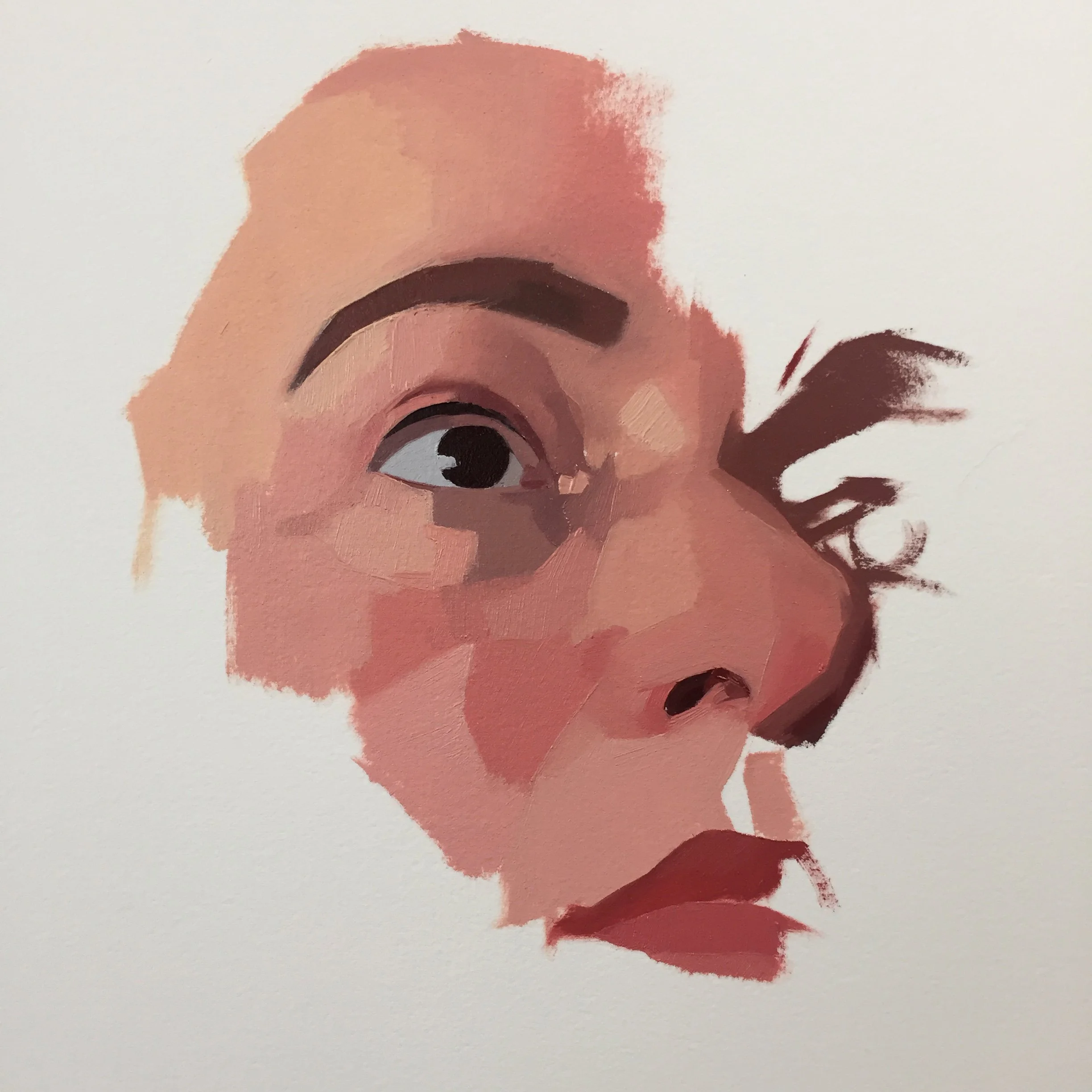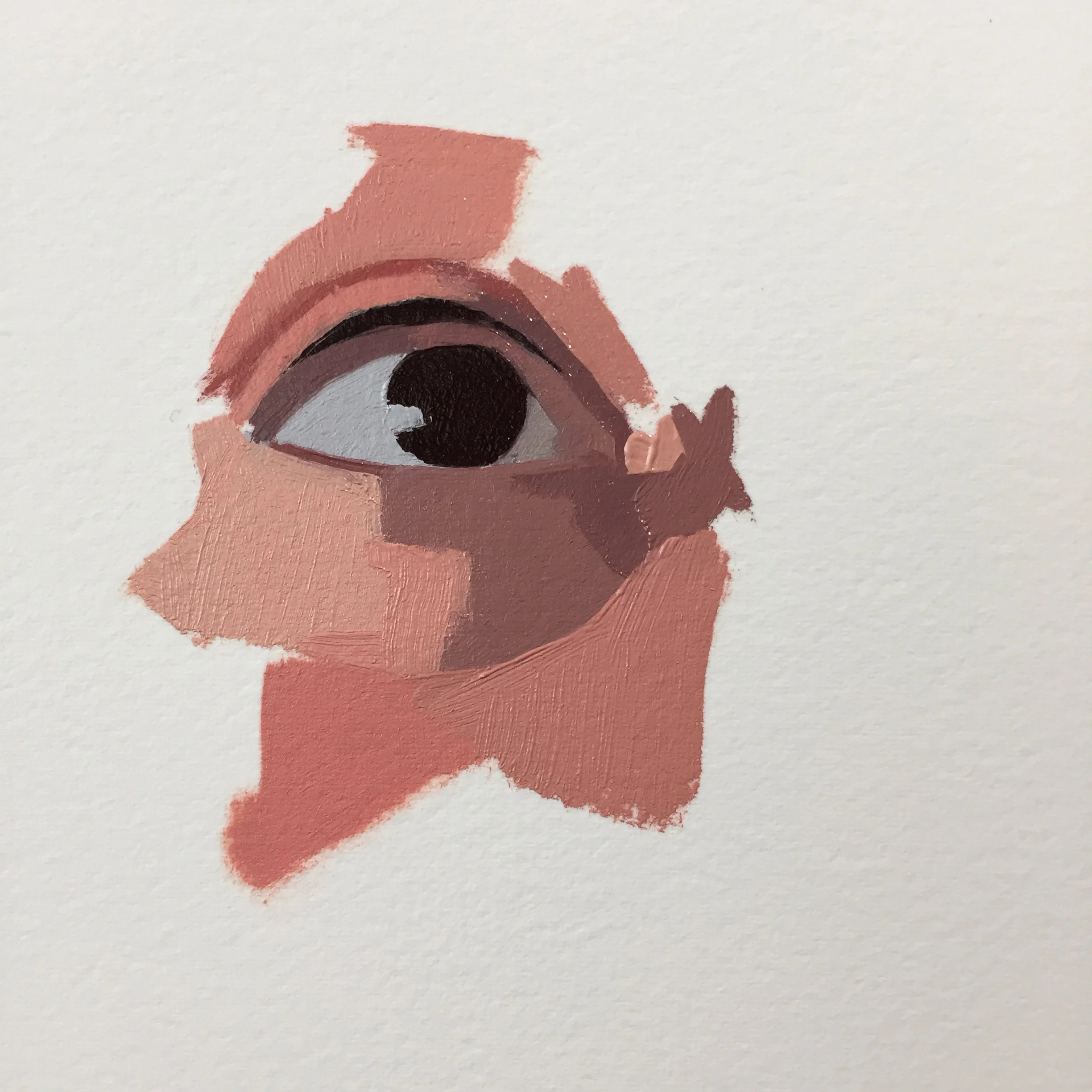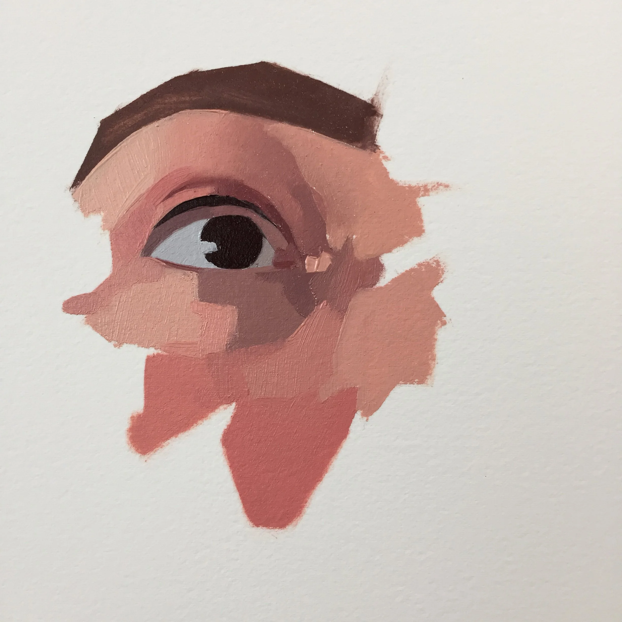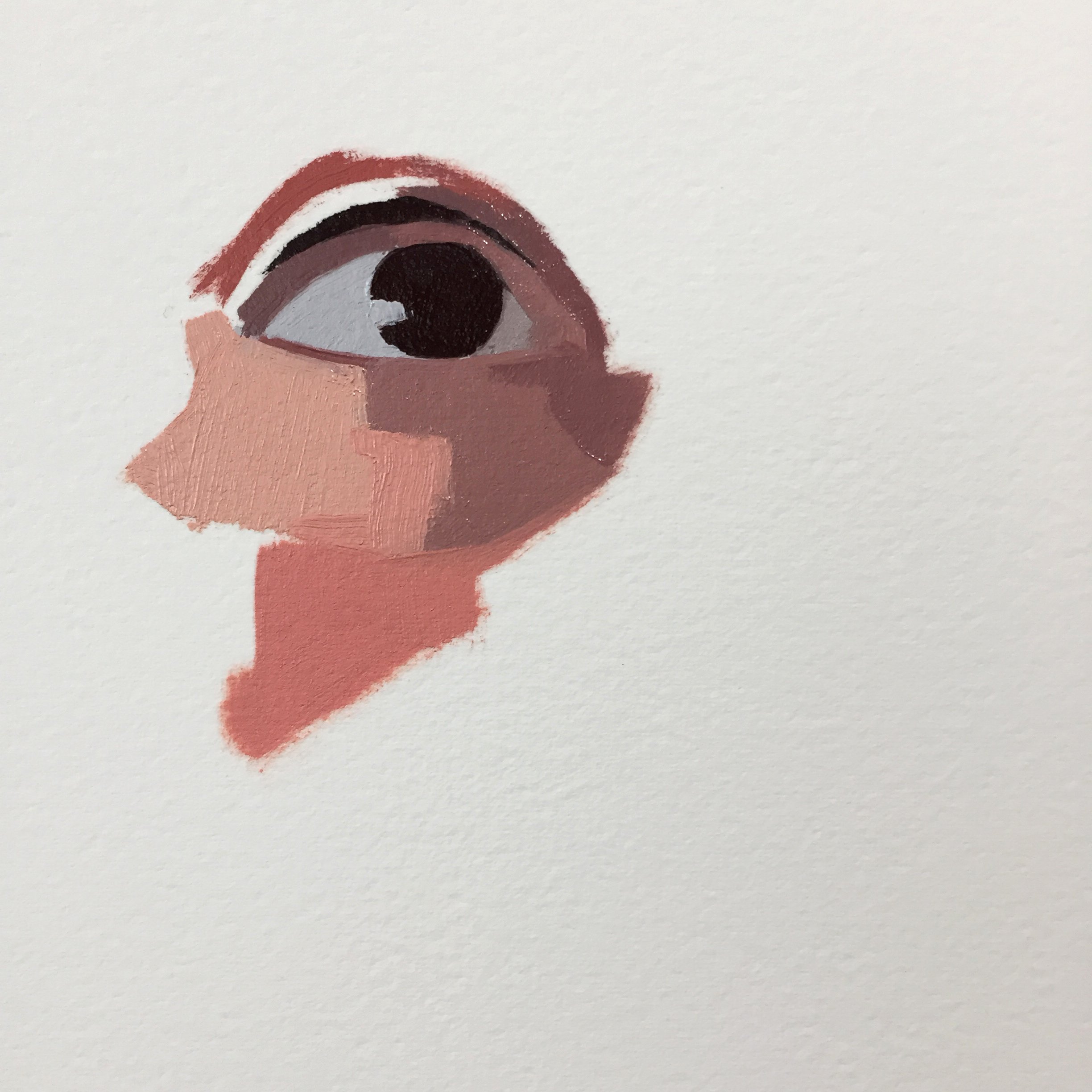 Choose the very next shape that is touching the first shape you made (eyelid or white of the eye… for example) and try to mix the right color and value for that second shape - then place that paint in the correct spot on the canvas in the correct shape for what you intended, and right next to your first shape. It will be easier if you place one shape next to the last rather than jump all around the canvas (that would be an extreme level of difficulty!).