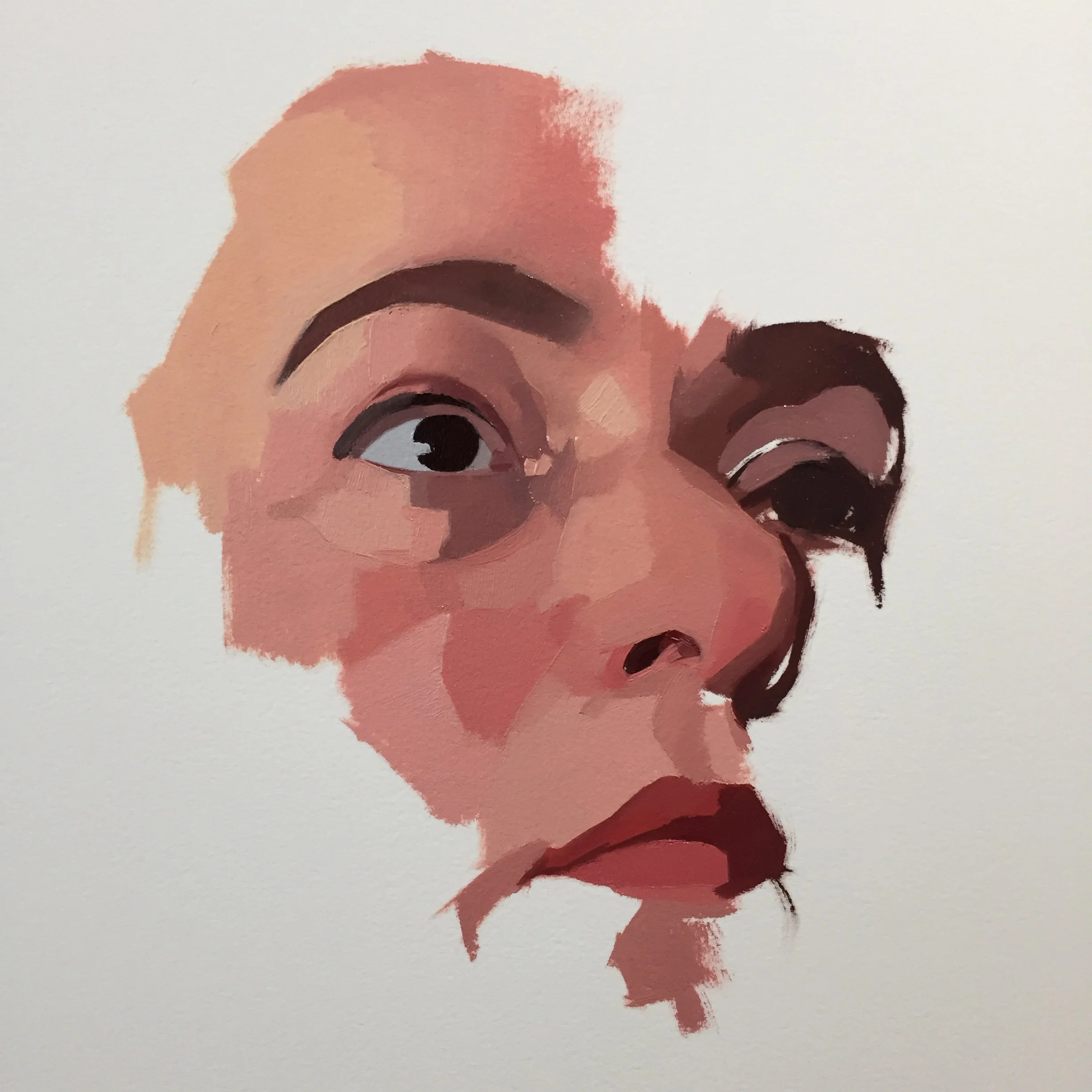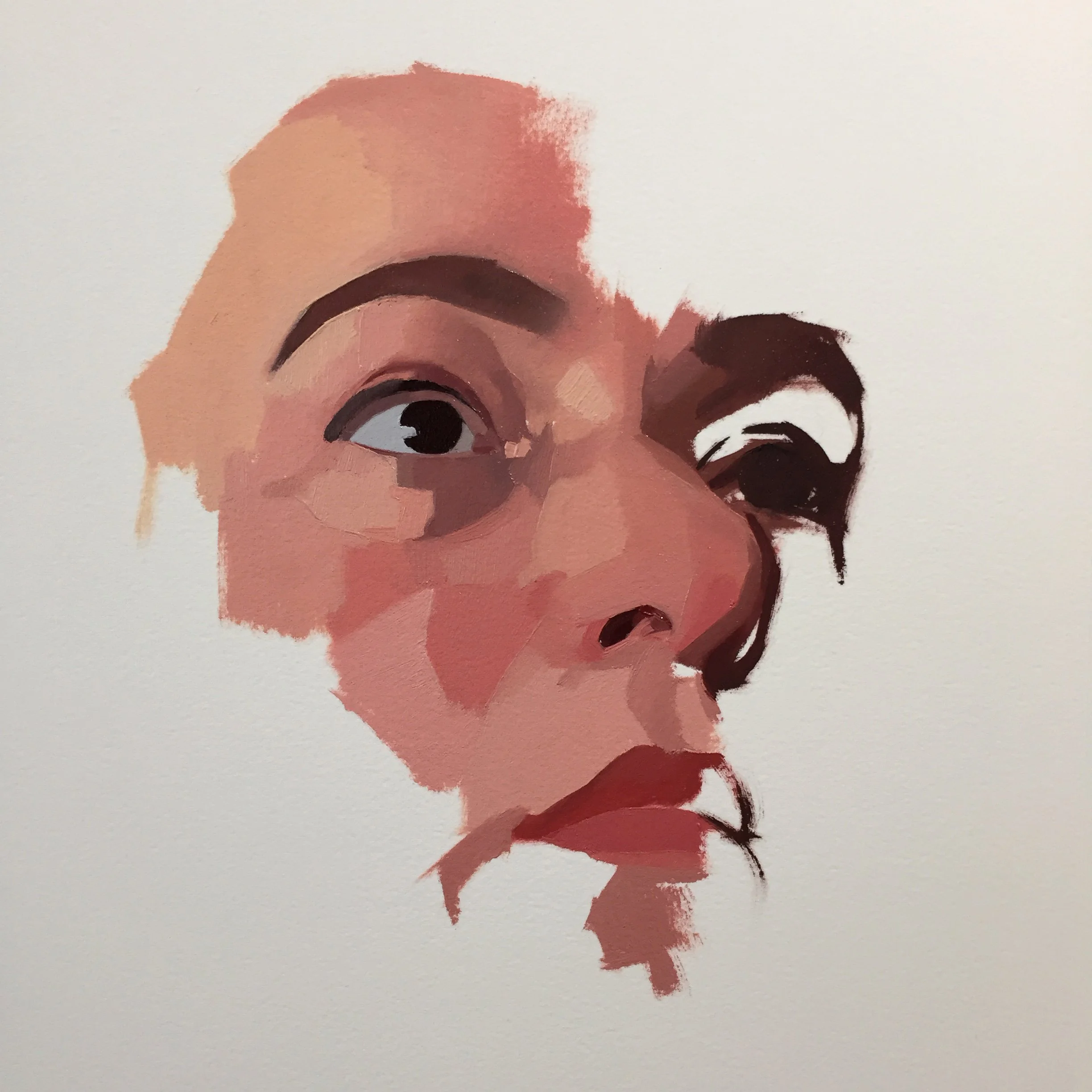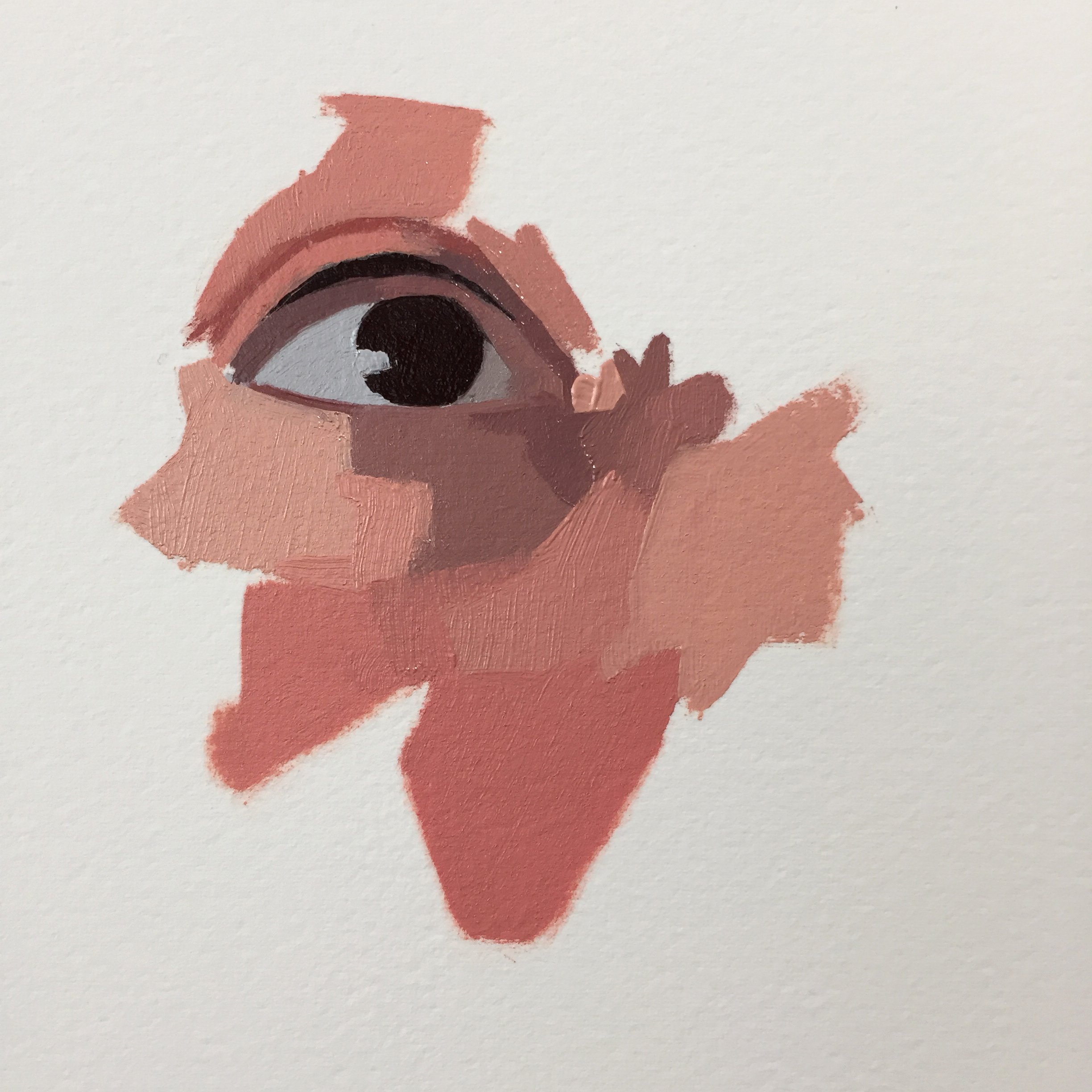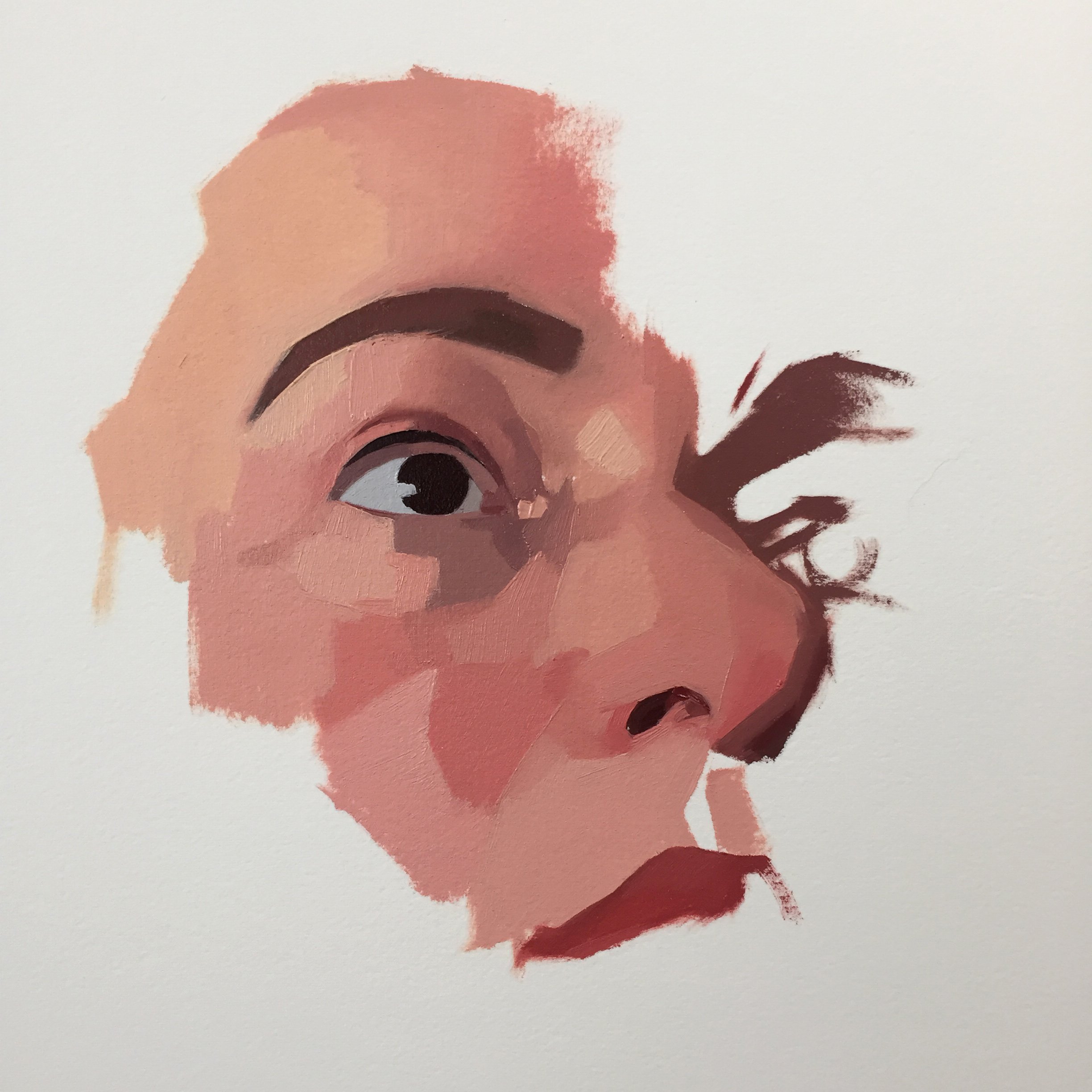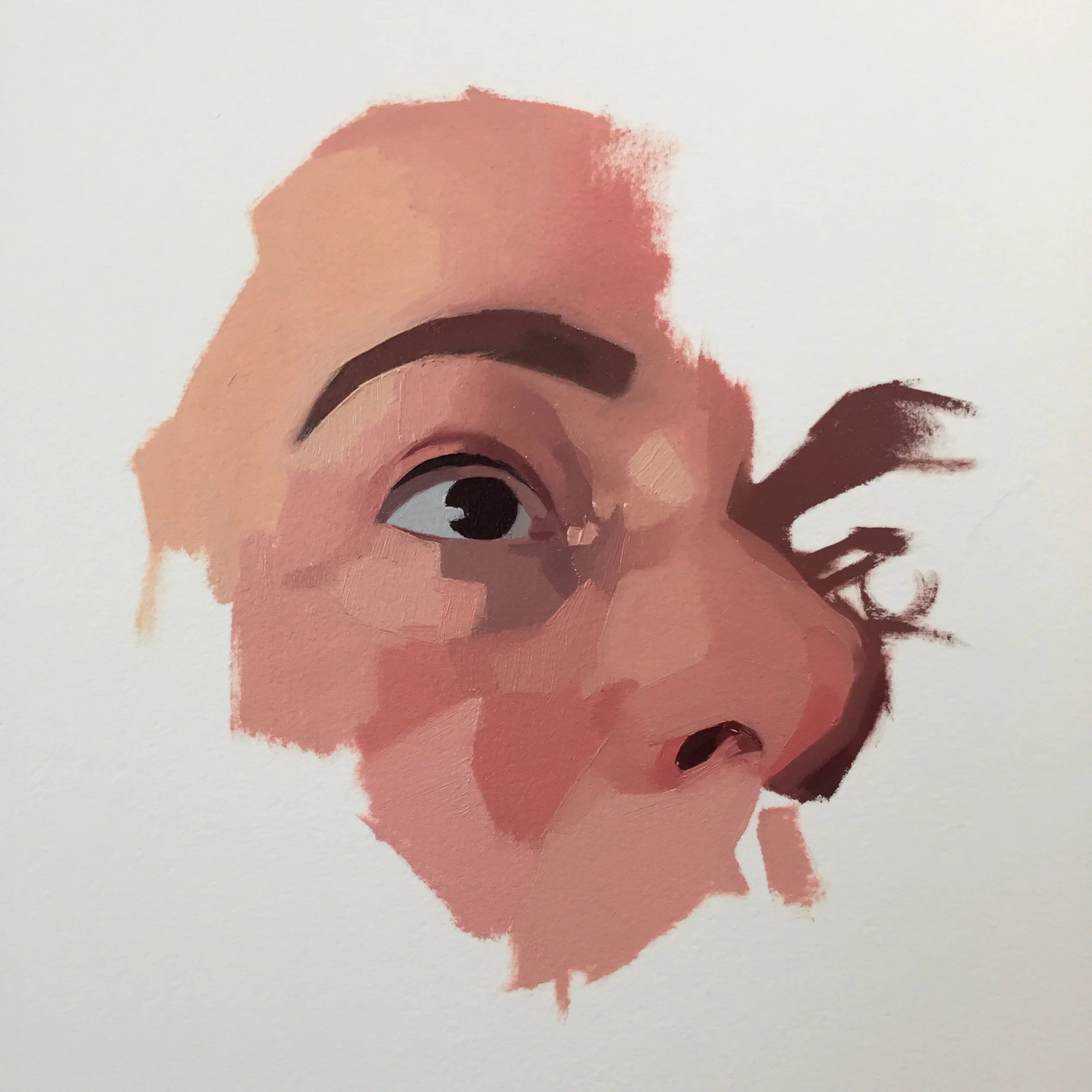 Choose the very next shape that is touching the first shape you made (eyelid or white of the eye… for example) and try to mix the right color and value for that second shape - then place that paint in the correct spot on the canvas in the correct shape for what you intended, and right next to your first shape. It will be easier if you place one shape next to the last rather than jump all around the canvas (that would be an extreme level of difficulty!).